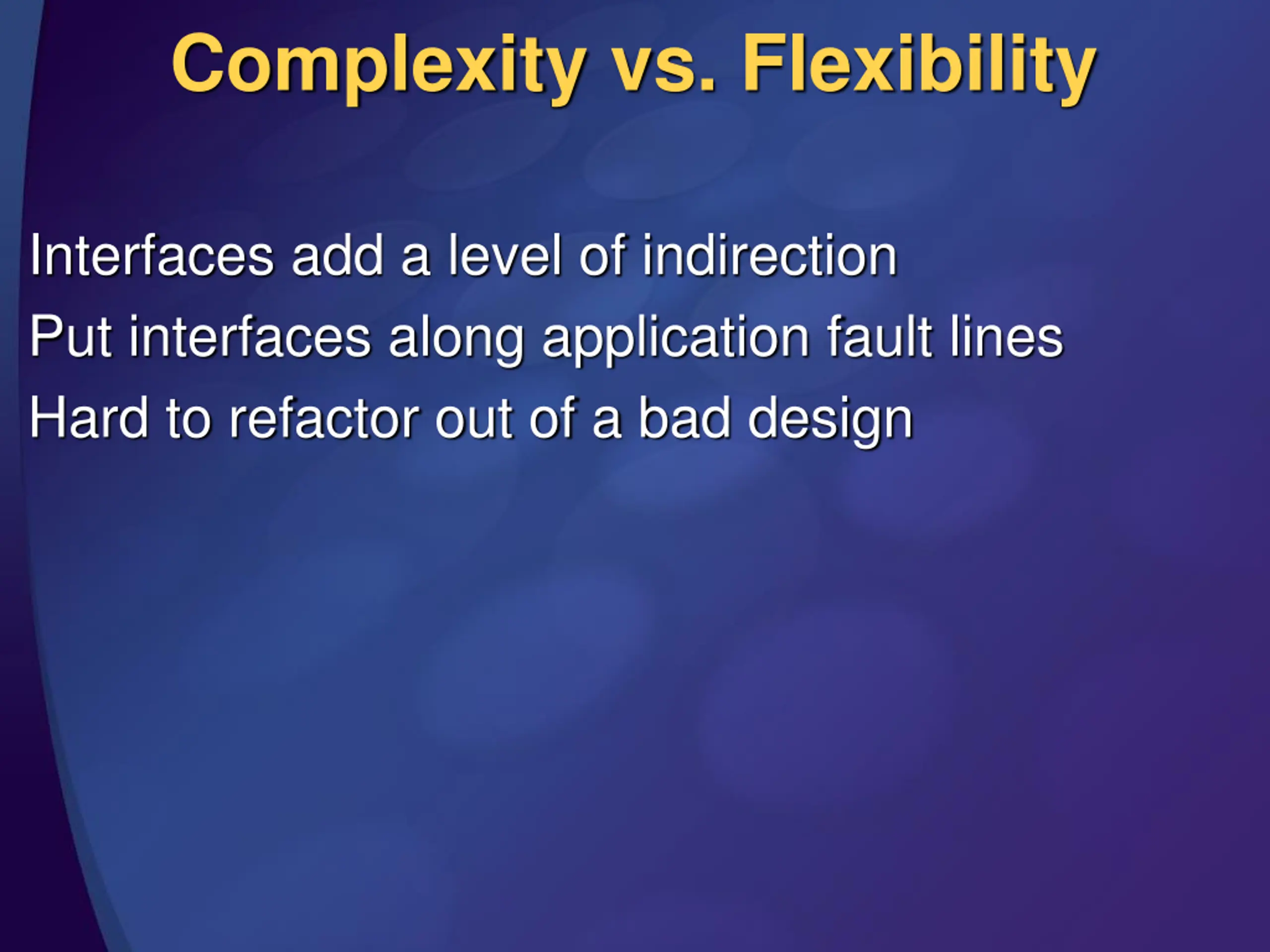 Complexity vs. Flexibility Interfaces add a level of indirection Put interfaces along application fault lines Hard to refactor out of a bad design