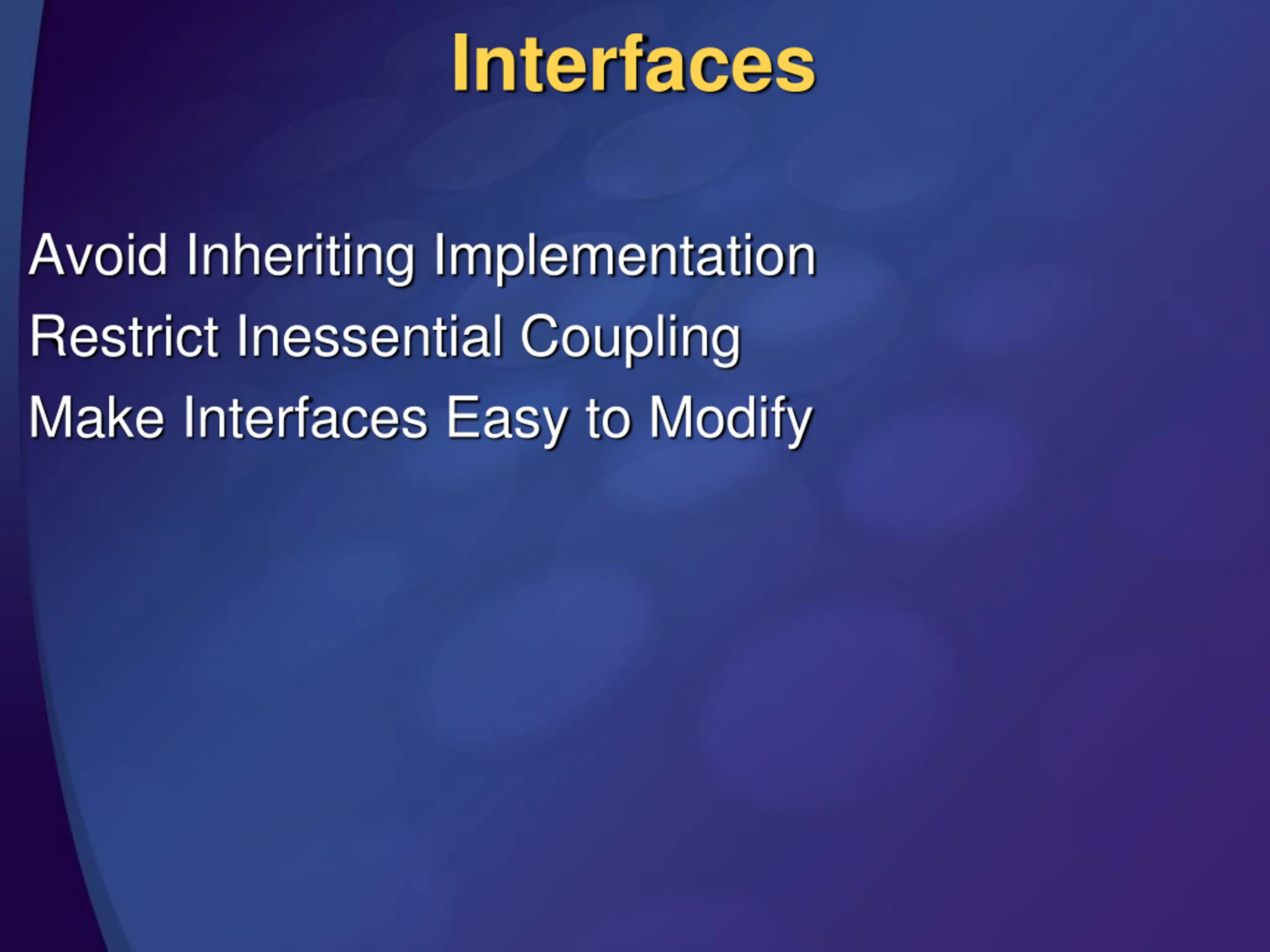 Interfaces Avoid Inheriting Implementation Restrict Inessential Coupling Make Interfaces Easy to Modify
