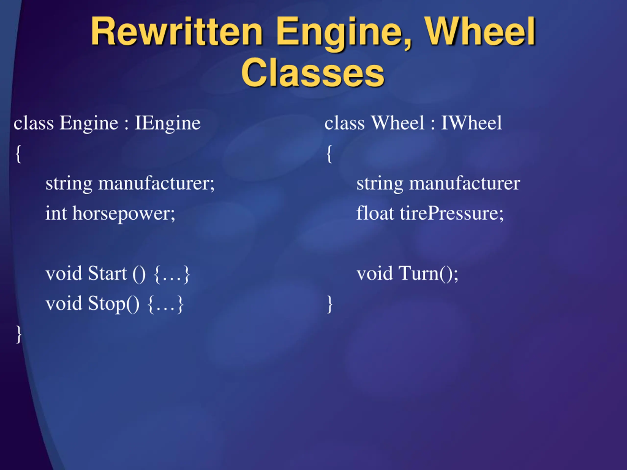 Rewritten Engine, Wheel Classes class Engine : IEngine { string manufacturer; int horsepower; class Wheel : IWheel { string manufacturer float tirePressure; } } void Turn(); void Start () { } void Stop() { }