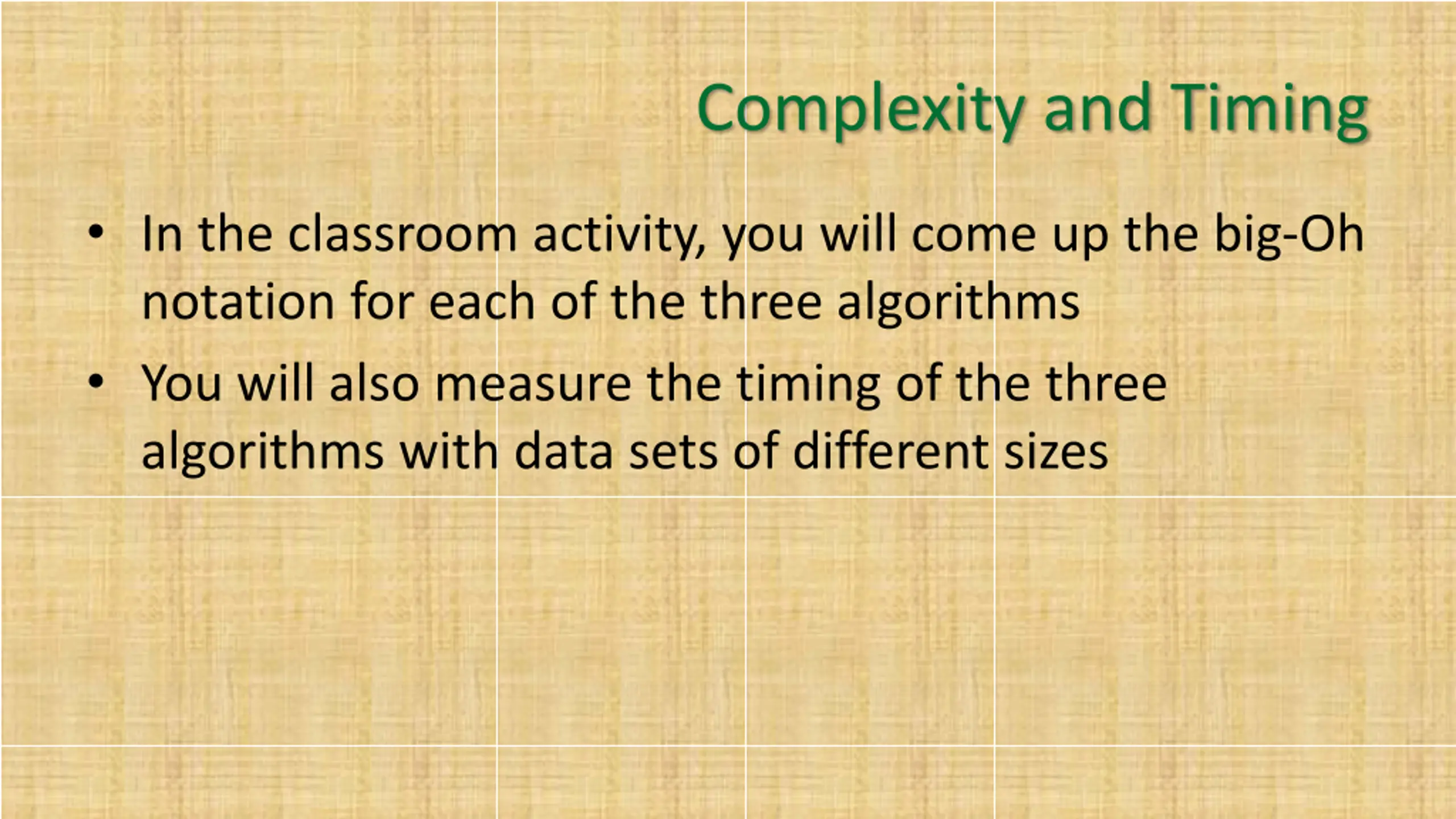 Complexity and Timing In the classroom activity, you will come up the big-Oh notation for each of the three algorithms You will also measure the timing of the three algorithms with data sets of different sizes