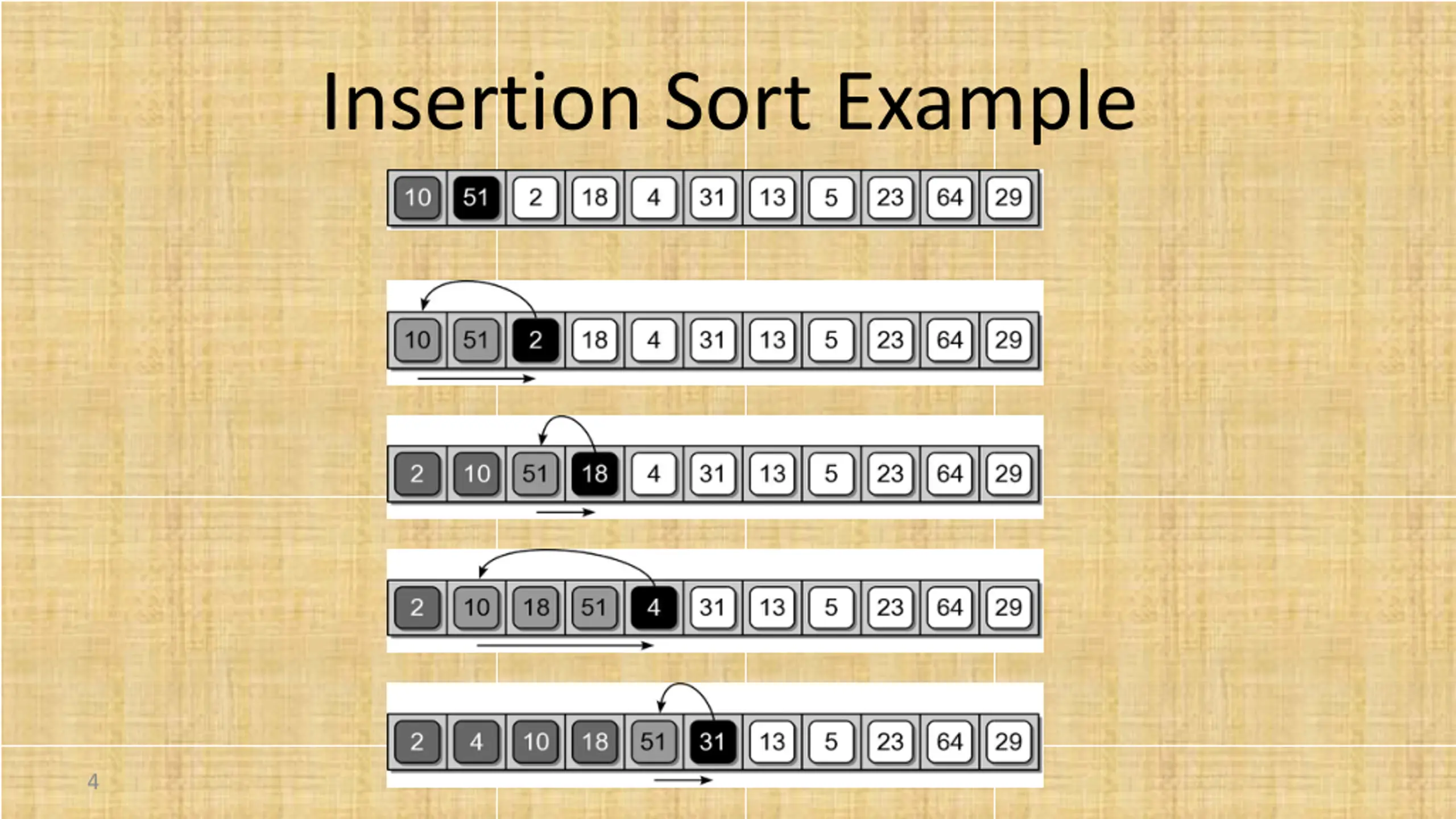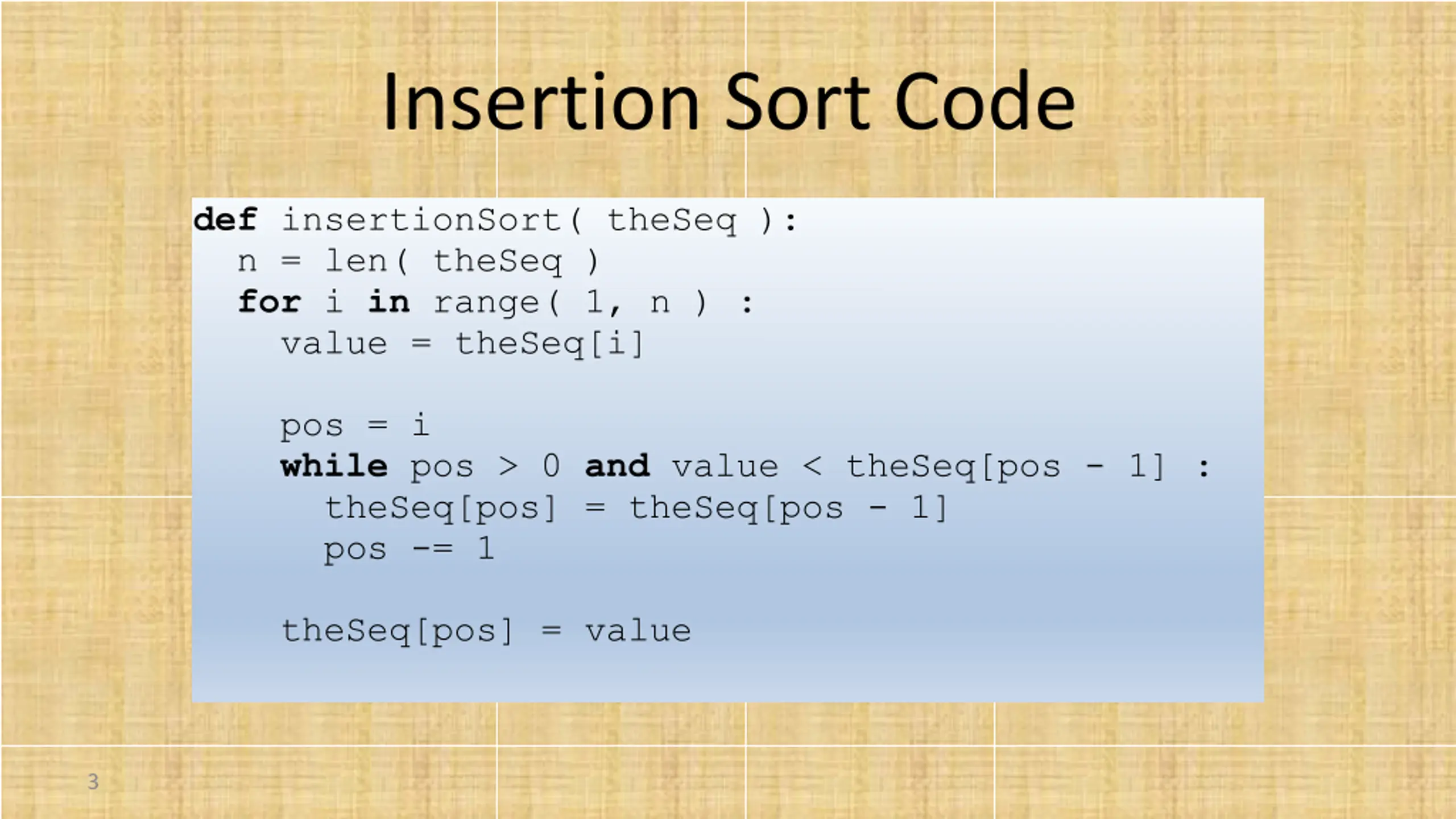 Insertion Sort Code def insertionSort( theSeq ): n = len( theSeq ) for i in range( 1, n ) : value = theSeq[i] pos = i while pos > 0 and value < theSeq[pos - 1] : theSeq[pos] = theSeq[pos - 1] pos -= 1 theSeq[pos] = value 3