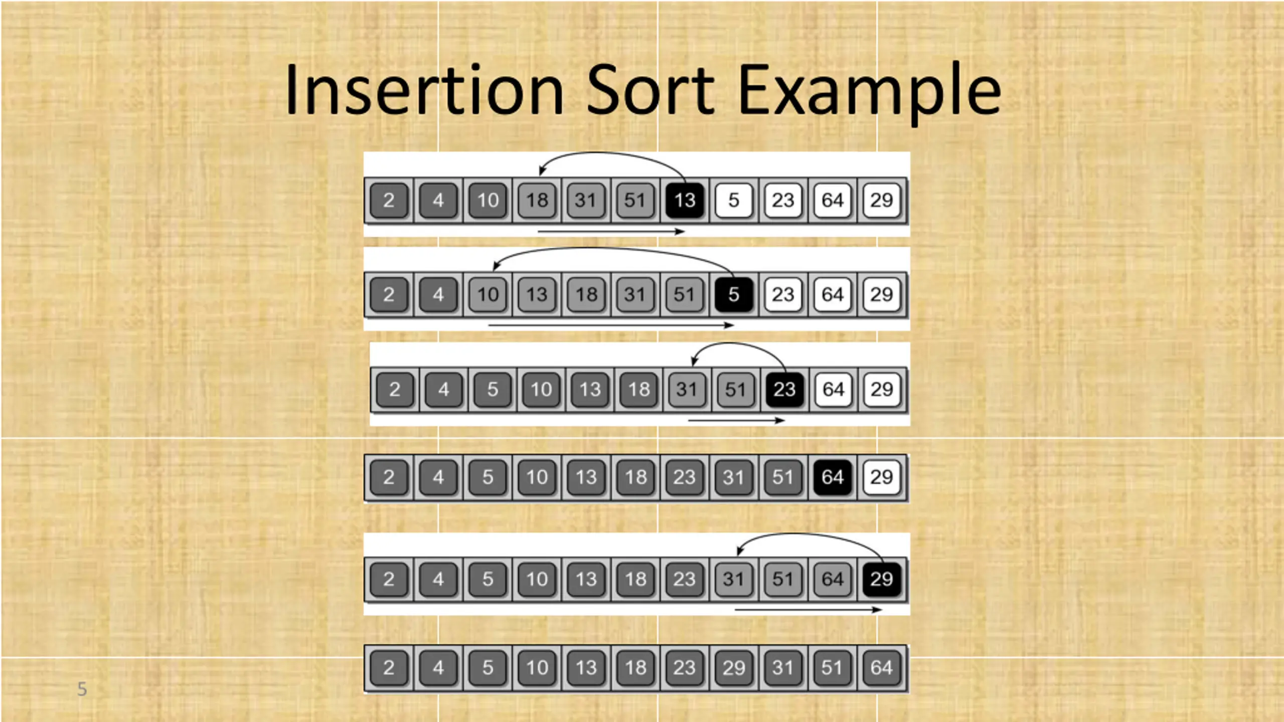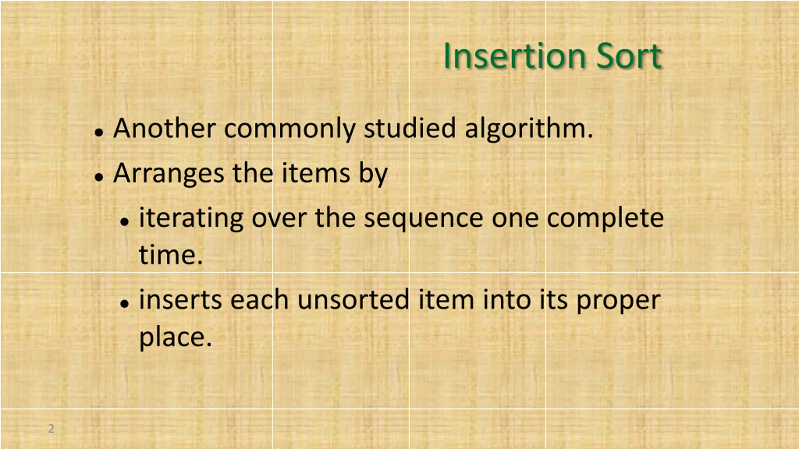 Insertion Sort Another commonly studied algorithm. Arranges the items by iterating over the sequence one complete time. inserts each unsorted item into its proper place. 2