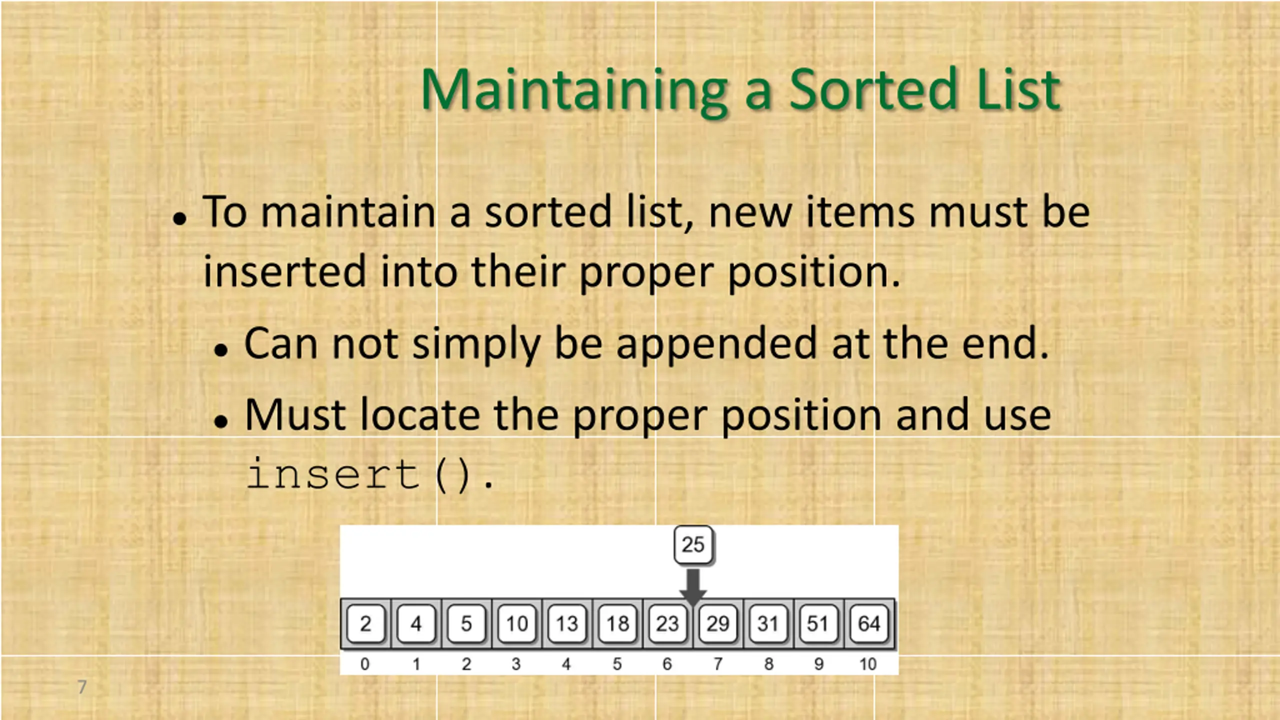 Maintaining a Sorted List To maintain a sorted list, new items must be inserted into their proper position. Can not simply be appended at the end. Must locate the proper position and use insert(). 7