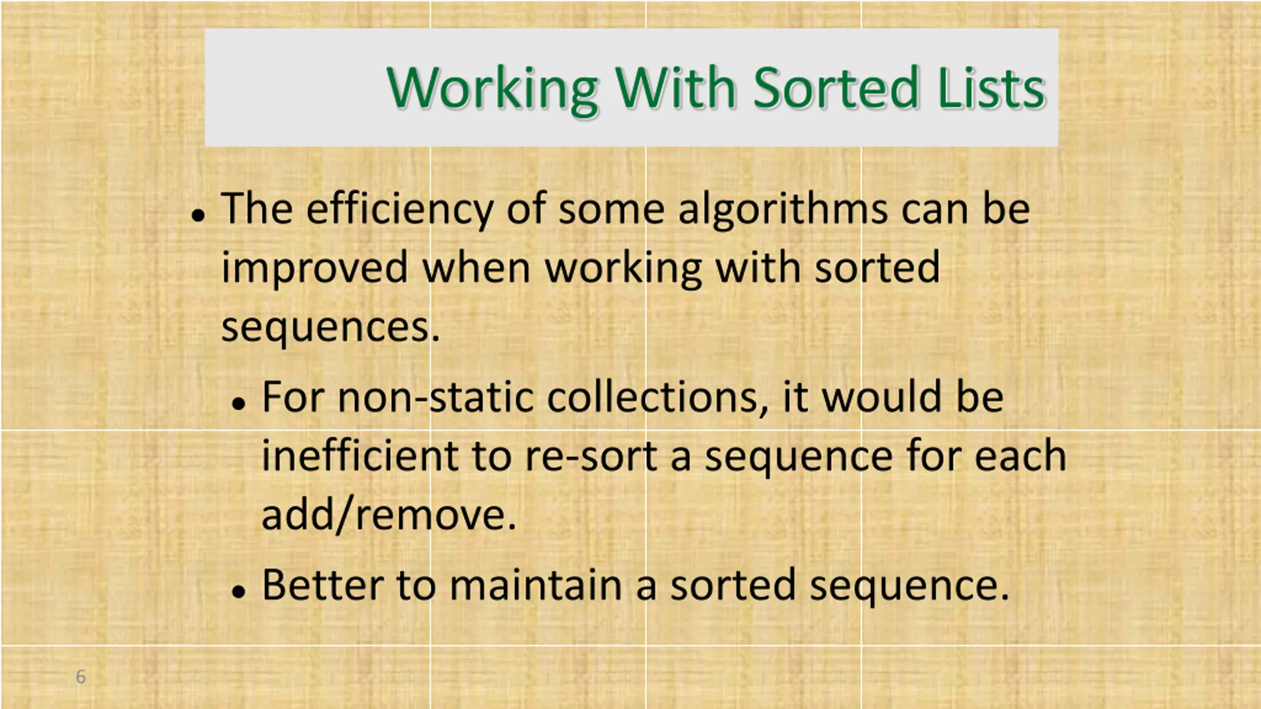 Working With Sorted Lists The efficiency of some algorithms can be improved when working with sorted sequences. For non-static collections, it would be inefficient to re-sort a sequence for each add/remove. Better to maintain a sorted sequence. 6