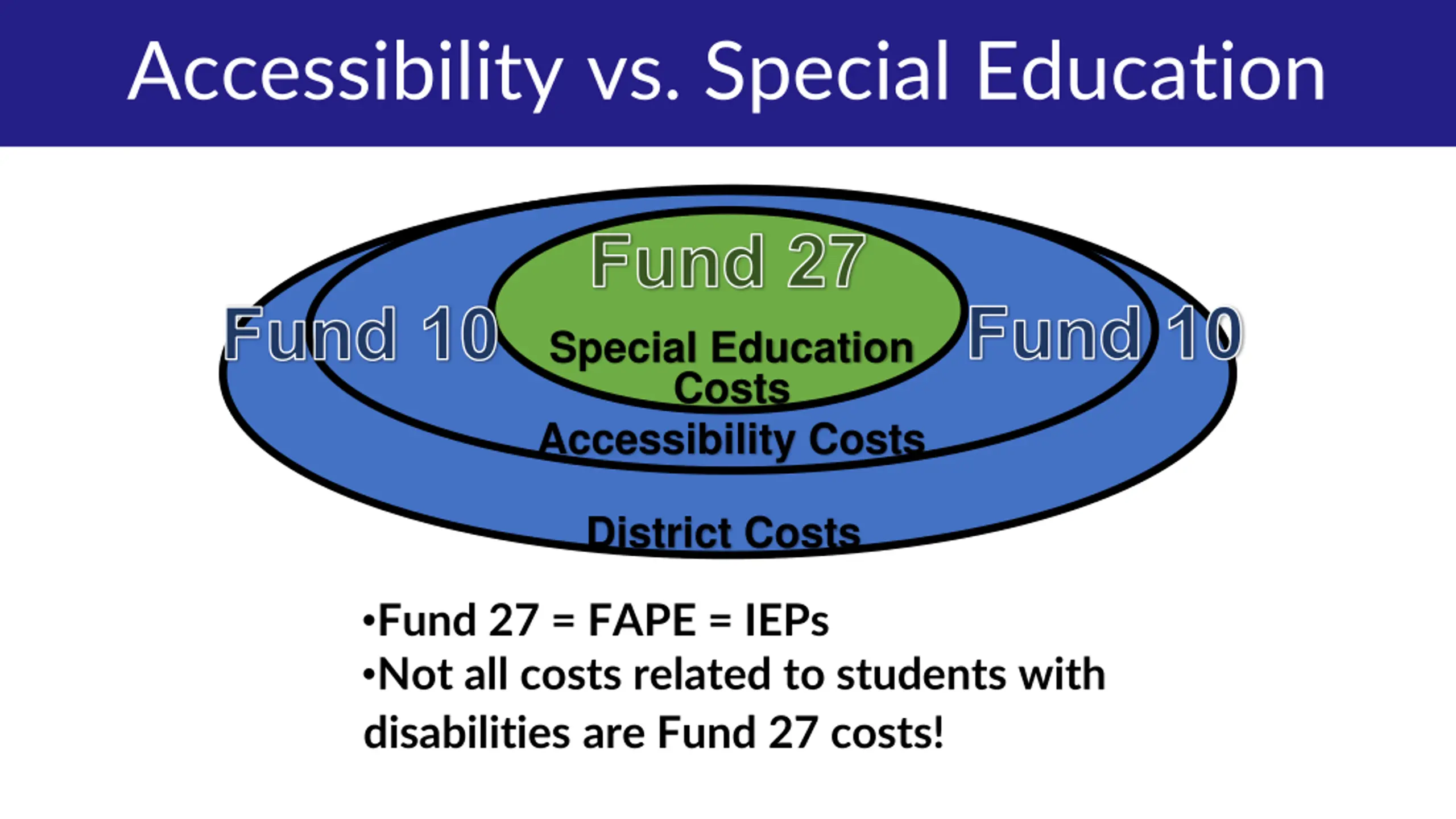 Accessibility vs. Special Education Fund 27 Fund 10 Fund 10 Special Education Costs Accessibility Costs District Costs Fund 27 = FAPE = IEPs Not all costs related to students with disabilities are Fund 27 costs!