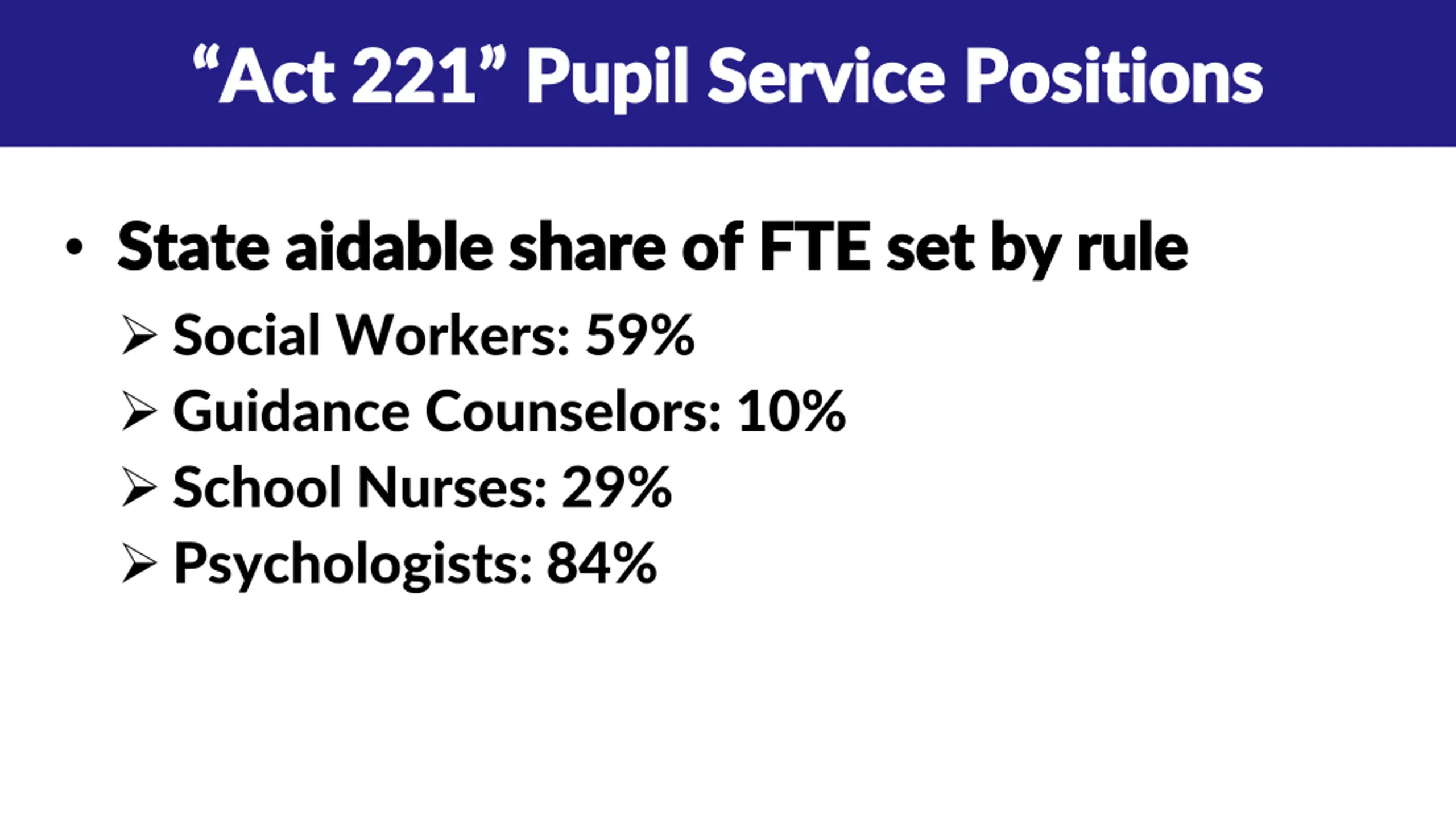 Act 221 Pupil Service Positions Act 221 Pupil Service Positions State State aidable Social Workers: 59% Guidance Counselors: 10% School Nurses: 29% Psychologists: 84% aidable share of FTE set by rule share of FTE set by rule