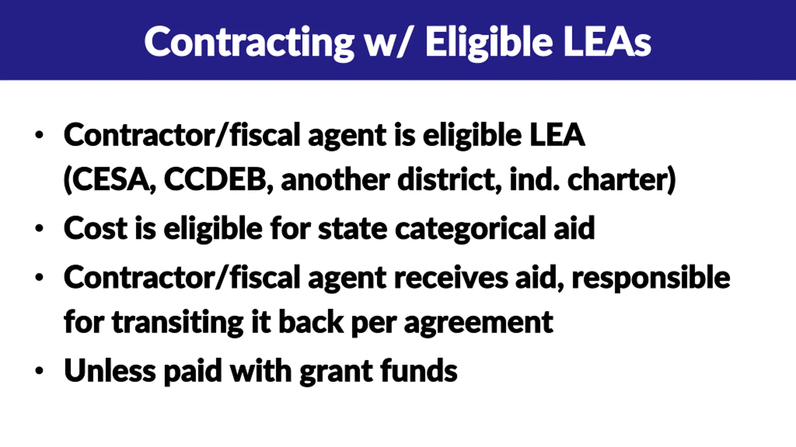Contracting w/ Eligible LEAs Contracting w/ Eligible LEAs Contractor/fiscal agent is eligible LEA Contractor/fiscal agent is eligible LEA (CESA, CCDEB, another district, (CESA, CCDEB, another district, ind. Cost is eligible for state categorical aid Cost is eligible for state categorical aid Contractor/fiscal agent receives aid, responsible Contractor/fiscal agent receives aid, responsible for transiting it back per agreement for transiting it back per agreement Unless paid with grant funds Unless paid with grant funds ind. charter) charter)