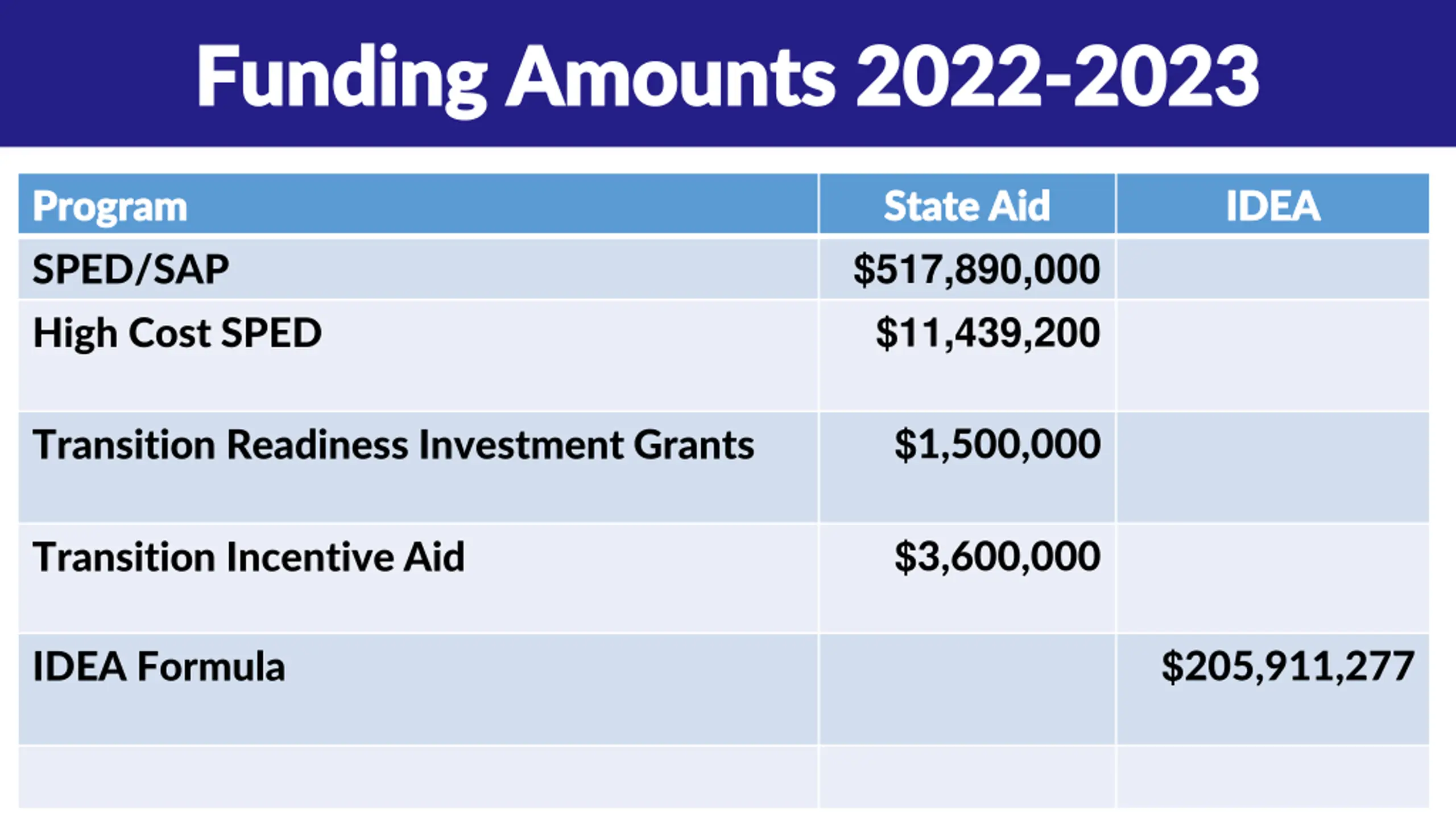 Funding Amounts 2022 Funding Amounts 2022- -2023 2023 Program Program SPED/SAP High Cost SPED State Aid State Aid $517,890,000 $11,439,200 IDEA IDEA $1,500,000 Transition Readiness Investment Grants $3,600,000 Transition Incentive Aid $205,911,277 IDEA Formula