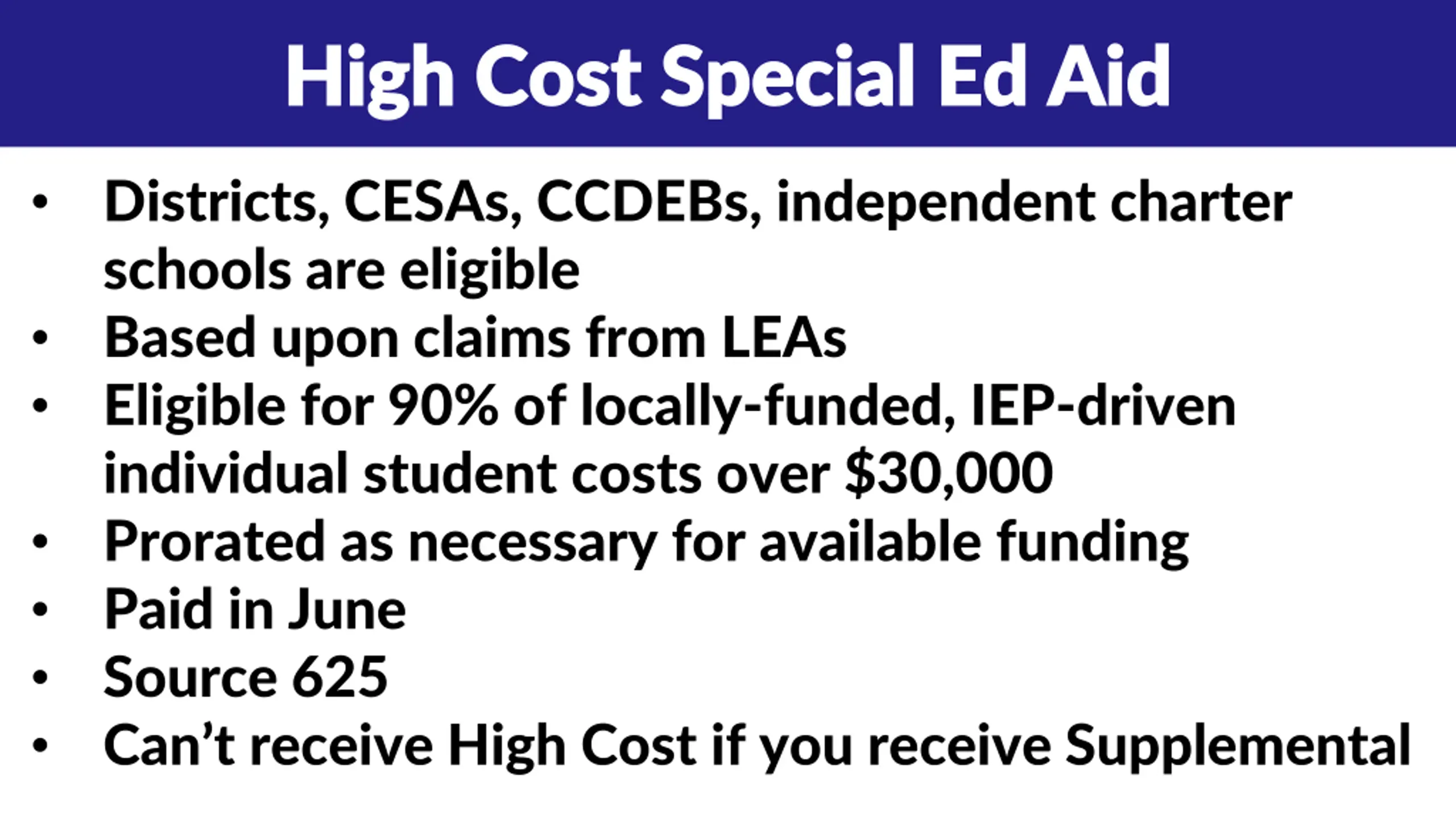 High Cost Special Ed Aid High Cost Special Ed Aid Districts, CESAs, CCDEBs, independent charter schools are eligible Based upon claims from LEAs Eligible for 90% of locally-funded, IEP-driven individual student costs over $30,000 Prorated as necessary for available funding Paid in June Source 625 Can t receive High Cost if you receive Supplemental
