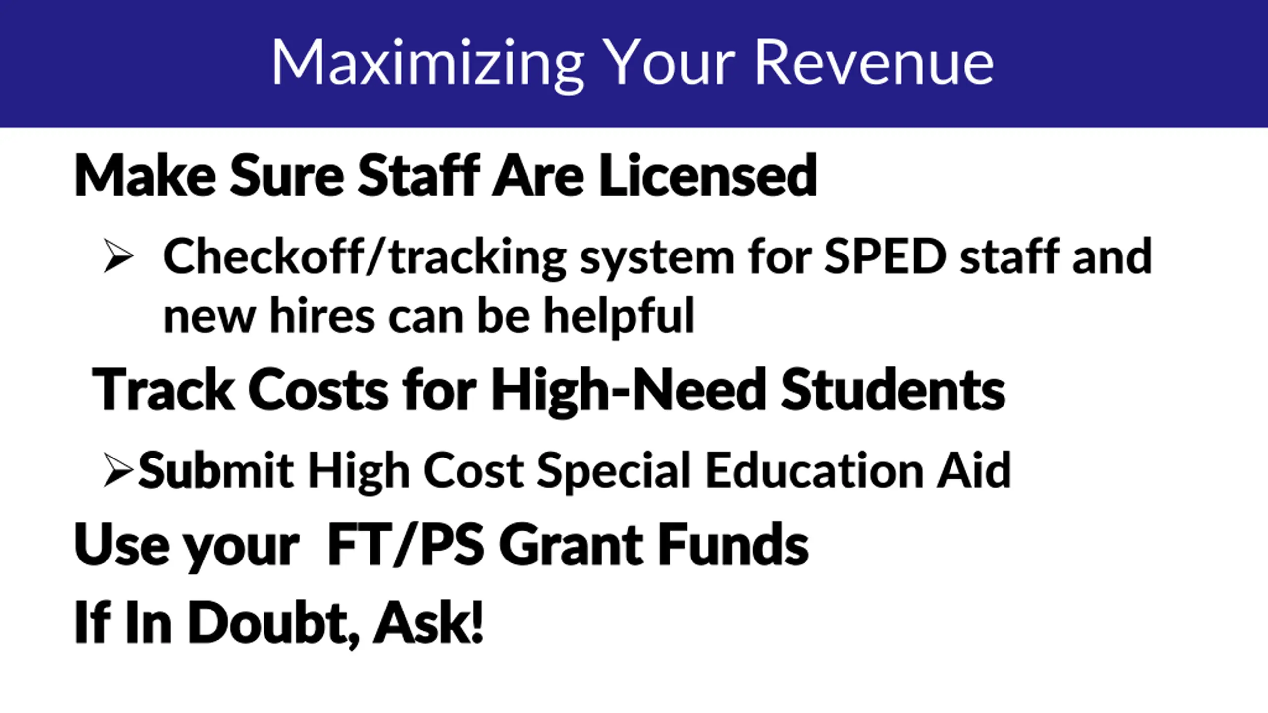 Maximizing Your Revenue Make Sure Staff Are Licensed Make Sure Staff Are Licensed Checkoff/tracking system for SPED staff and new hires can be helpful Track Costs for High Track Costs for High- -Need Students Sub Submit High Cost Special Education Aid Use your Use your FT/PS Grant Funds FT/PS Grant Funds If In Doubt, Ask! If In Doubt, Ask! Need Students
