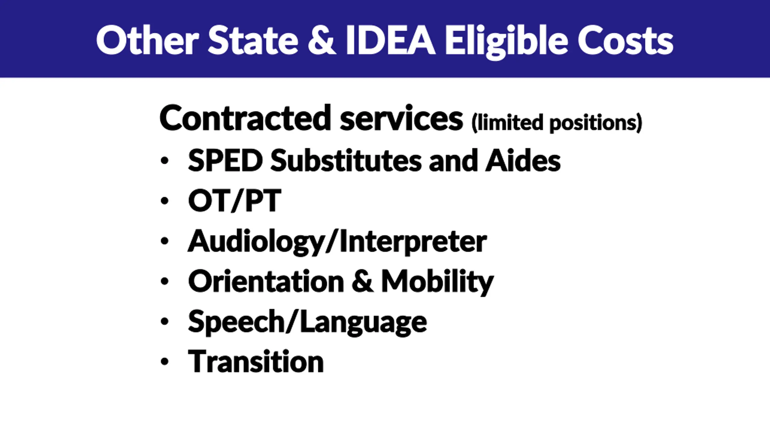 Other State & IDEA Eligible Costs Other State & IDEA Eligible Costs Contracted services Contracted services (limited positions) SPED Substitutes and Aides SPED Substitutes and Aides OT/PT OT/PT Audiology/Interpreter Audiology/Interpreter Orientation & Mobility Orientation & Mobility Speech/Language Speech/Language Transition Transition (limited positions)