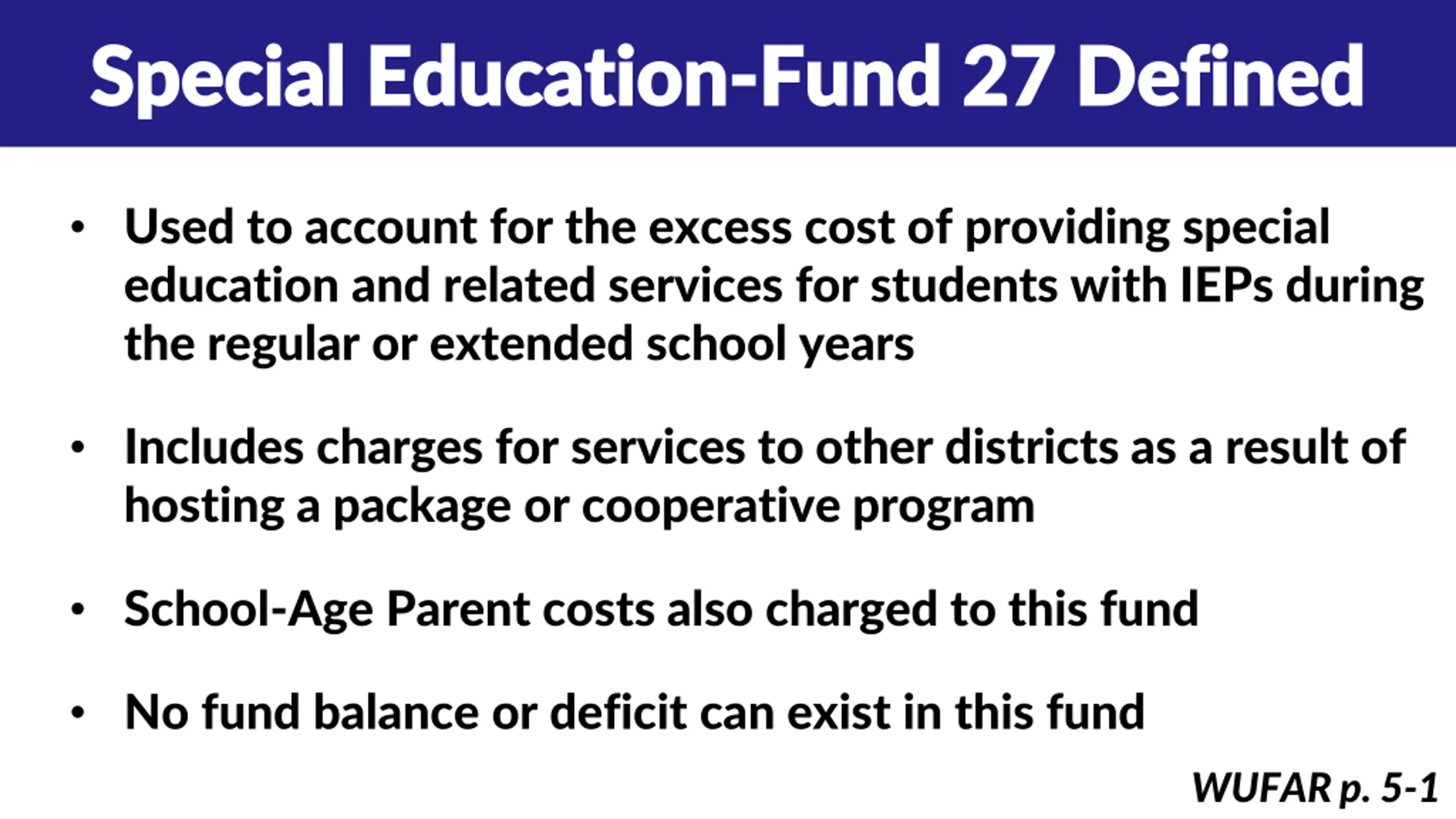 Special Education Special Education- -Fund 27 Defined Fund 27 Defined Used to account for the excess cost of providing special education and related services for students with IEPs during the regular or extended school years Includes charges for services to other districts as a result of hosting a package or cooperative program School-Age Parent costs also charged to this fund No fund balance or deficit can exist in this fund WUFAR p. 5-1