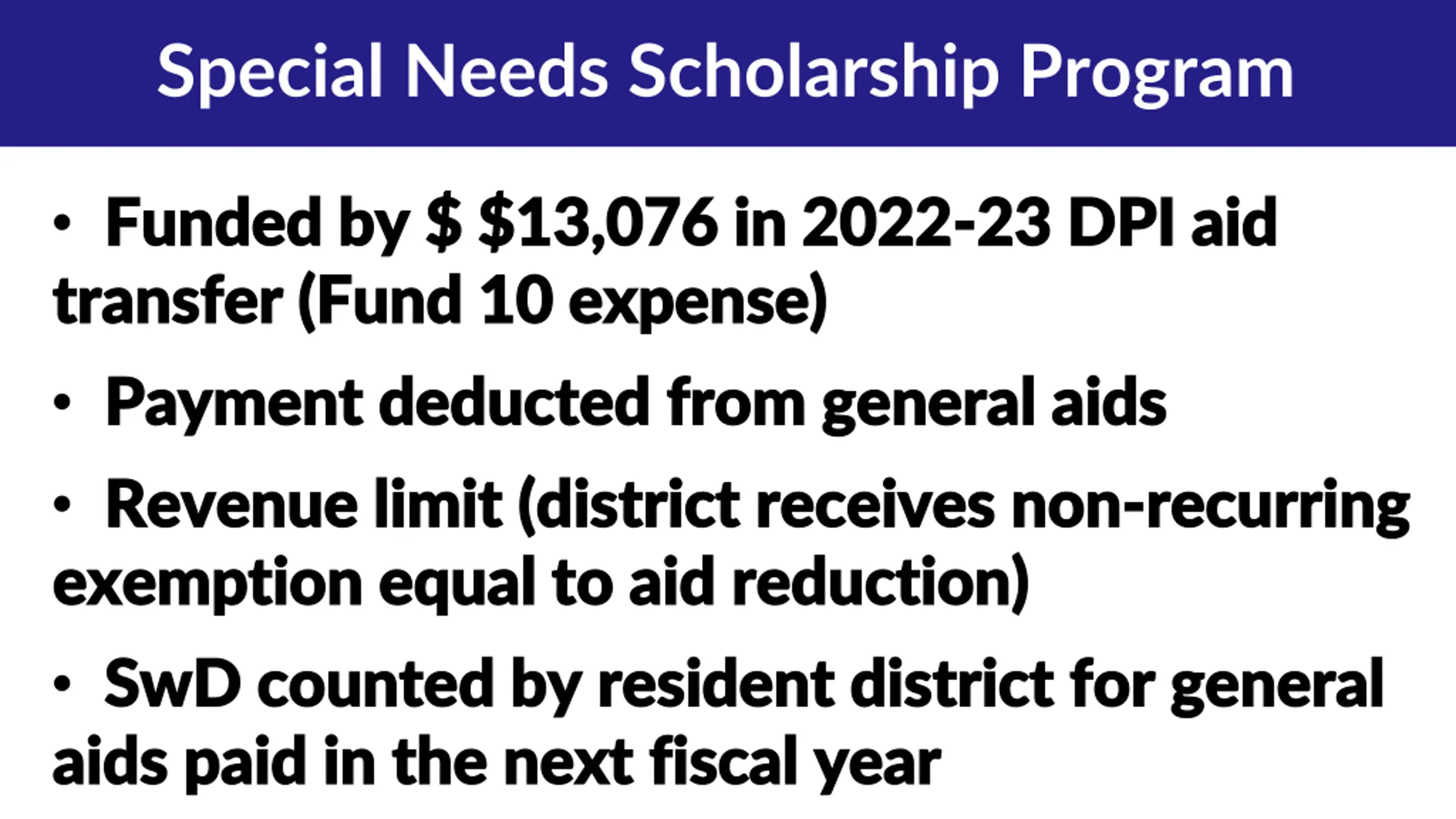 Special Needs Scholarship Program Funded by $ $13,076 in 2022 Funded by $ $13,076 in 2022- -23 DPI aid transfer (Fund 10 expense) transfer (Fund 10 expense) Payment deducted from general aids Payment deducted from general aids Revenue limit (district receives non Revenue limit (district receives non- -recurring exemption equal to aid reduction) exemption equal to aid reduction) SwD SwD counted by resident district for general counted by resident district for general aids paid in the next fiscal year aids paid in the next fiscal year 23 DPI aid recurring