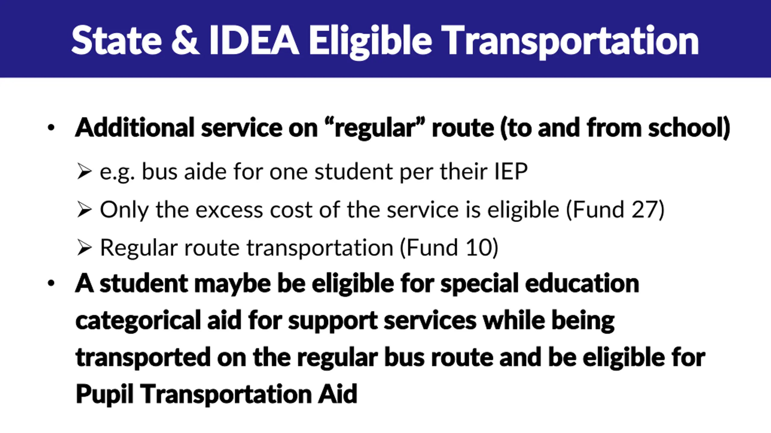 State & IDEA Eligible Transportation State & IDEA Eligible Transportation Additional service on regular route (to and from school) Additional service on regular route (to and from school) e.g. bus aide for one student per their IEP Only the excess cost of the service is eligible (Fund 27) Regular route transportation (Fund 10) A student maybe be eligible for special education A student maybe be eligible for special education categorical aid for support services while being categorical aid for support services while being transported on the regular bus route and be eligible for transported on the regular bus route and be eligible for Pupil Transportation Aid Pupil Transportation Aid