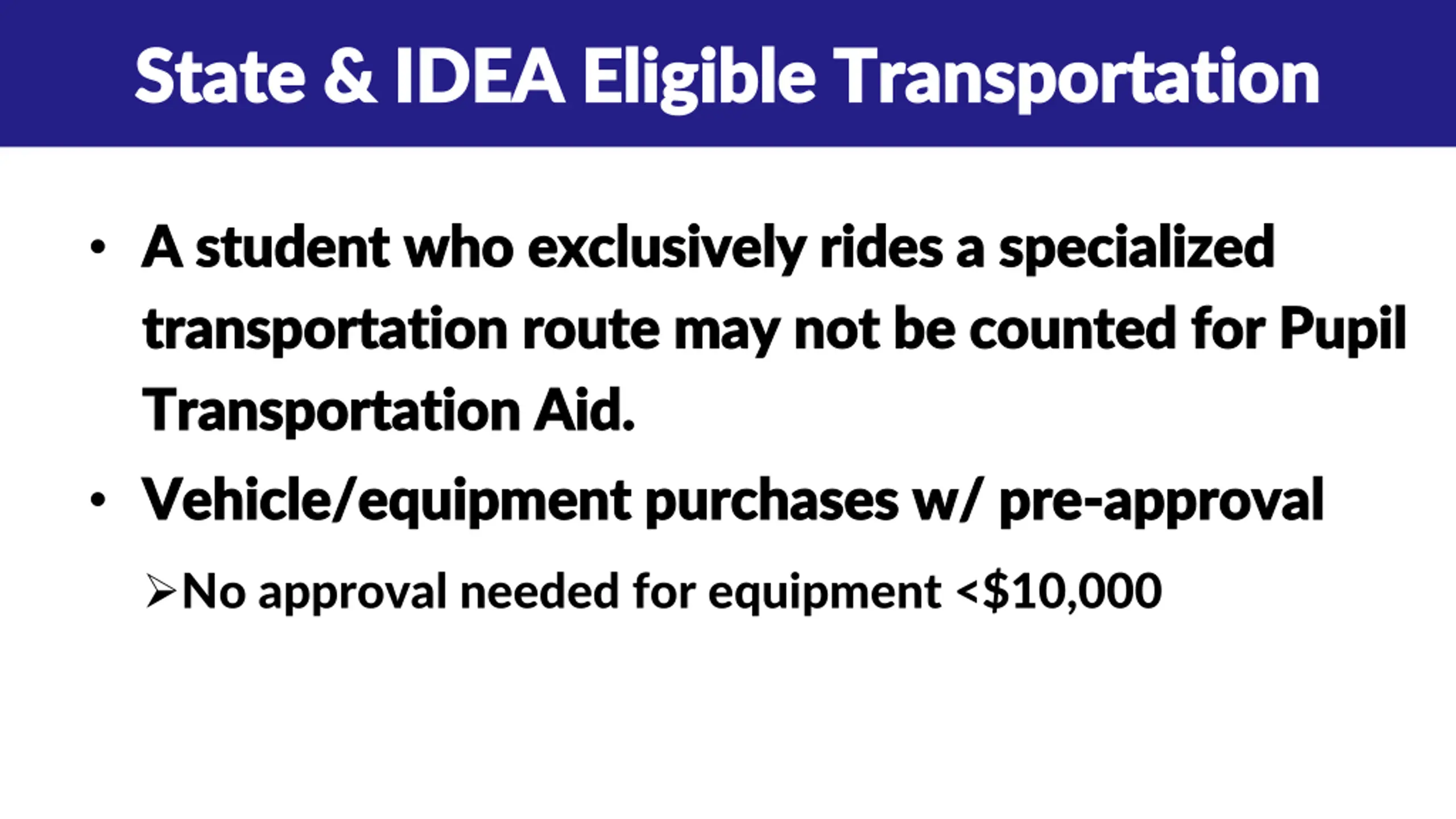 State & IDEA Eligible Transportation State & IDEA Eligible Transportation A student who exclusively rides a specialized A student who exclusively rides a specialized transportation route may not be counted for Pupil transportation route may not be counted for Pupil Transportation Aid. Transportation Aid. Vehicle/equipment purchases w/ pre Vehicle/equipment purchases w/ pre- -approval approval No approval needed for equipment <$10,000