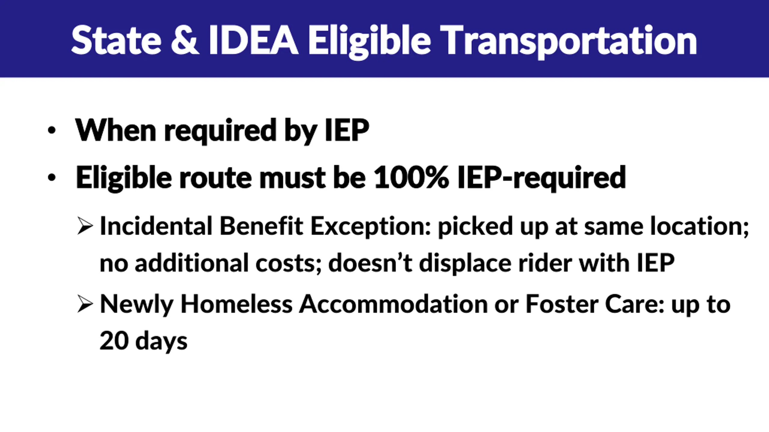 State & IDEA Eligible Transportation State & IDEA Eligible Transportation When required by IEP When required by IEP Eligible route must be 100% IEP Eligible route must be 100% IEP- -required required Incidental Benefit Exception: picked up at same location; no additional costs; doesn t displace rider with IEP Newly Homeless Accommodation or Foster Care: up to 20 days