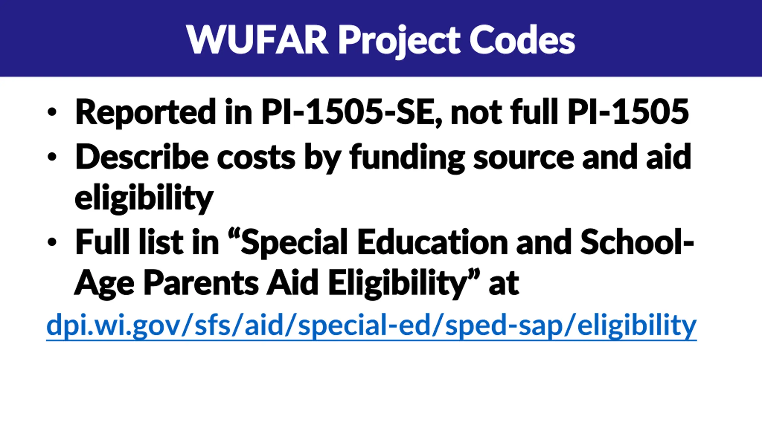 WUFAR Project Codes WUFAR Project Codes Reported in PI Reported in PI- -1505 Describe costs by funding source and aid Describe costs by funding source and aid eligibility eligibility Full list in Special Education and School Full list in Special Education and School- - Age Parents Aid Eligibility at Age Parents Aid Eligibility at dpi.wi.gov/sfs/aid/special-ed/sped-sap/eligibility 1505- -SE, not full PI SE, not full PI- -1505 1505