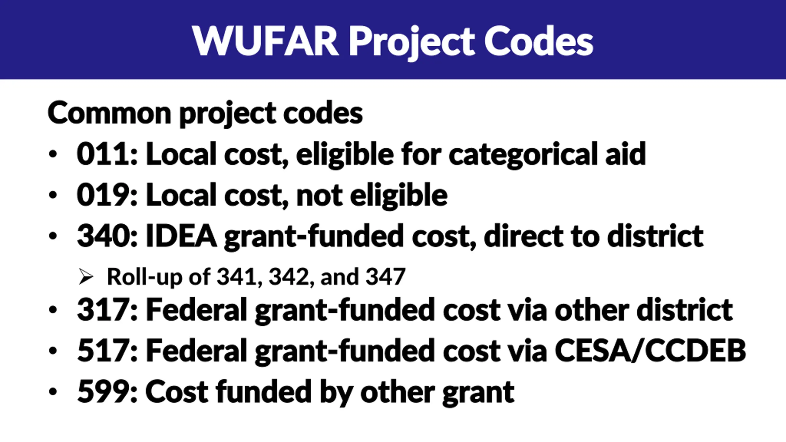 WUFAR Project Codes WUFAR Project Codes Common project codes Common project codes 011: Local cost, eligible for categorical aid 011: Local cost, eligible for categorical aid 019: Local cost, not eligible 019: Local cost, not eligible 340: IDEA grant 340: IDEA grant- -funded cost, direct to district funded cost, direct to district Roll-up of 341, 342, and 347 317: Federal grant 317: Federal grant- -funded cost via other district funded cost via other district 517: Federal grant 517: Federal grant- -funded cost via CESA/CCDEB funded cost via CESA/CCDEB 599: Cost funded by other grant 599: Cost funded by other grant