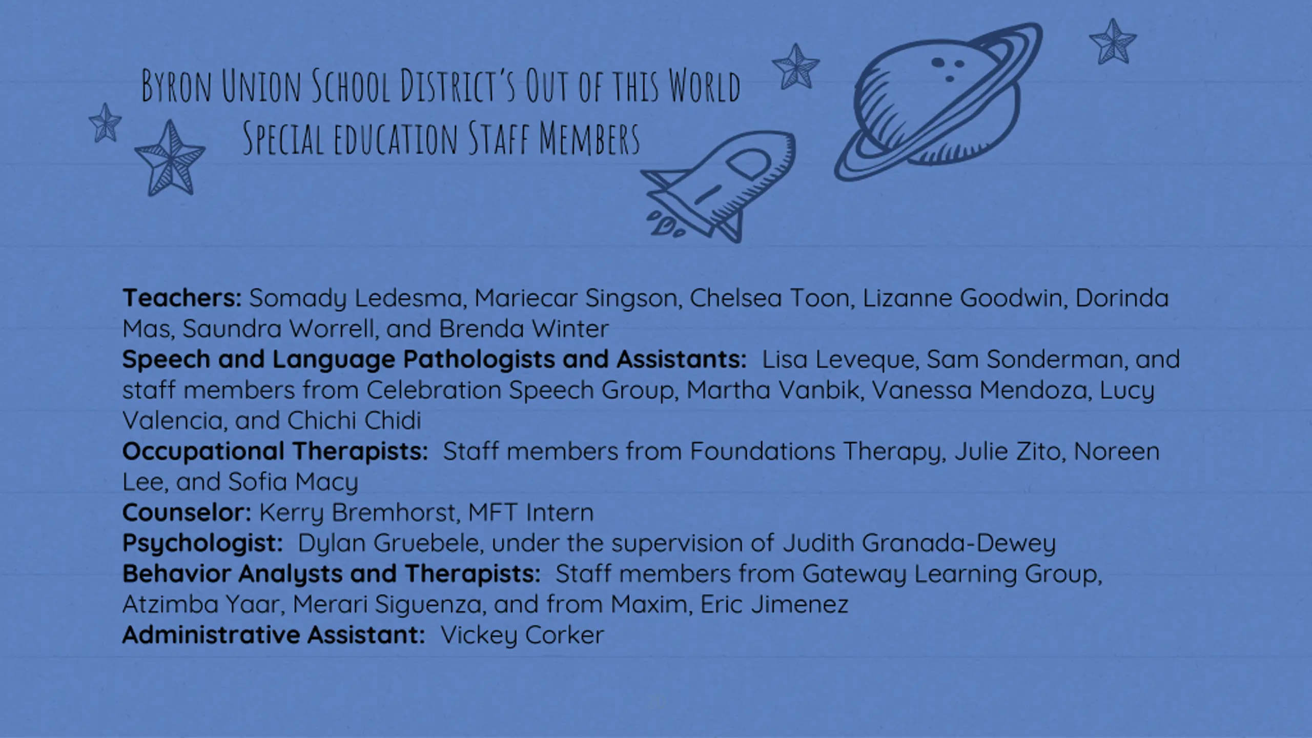 Byron Union School Districts Out of this World Special education Staff Members Teachers: Somady Ledesma, Mariecar Singson, Chelsea Toon, Lizanne Goodwin, Dorinda Mas, Saundra Worrell, and Brenda Winter Speech and Language Pathologists and Assistants: Lisa Leveque, Sam Sonderman, and staff members from Celebration Speech Group, Martha Vanbik, Vanessa Mendoza, Lucy Valencia, and Chichi Chidi Occupational Therapists: Staff members from Foundations Therapy, Julie Zito, Noreen Lee, and Sofia Macy Counselor: Kerry Bremhorst, MFT Intern Psychologist: Dylan Gruebele, under the supervision of Judith Granada-Dewey Behavior Analysts and Therapists: Staff members from Gateway Learning Group, Atzimba Yaar, Merari Siguenza, and from Maxim, Eric Jimenez Administrative Assistant: Vickey Corker 20