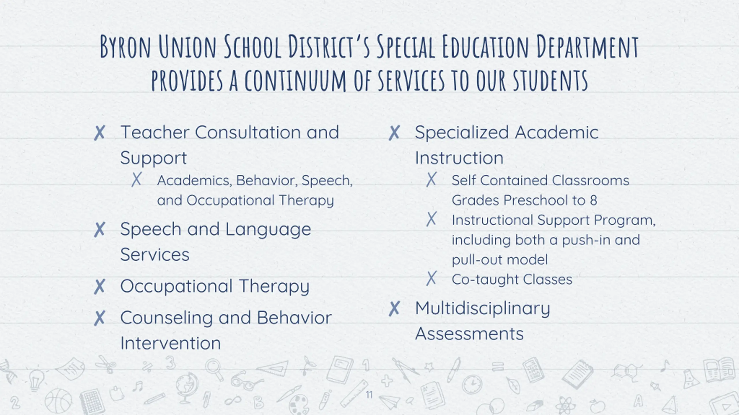Byron Union School Districts Special Education Department provides a continuum of services to our students Teacher Consultation and Support Academics, Behavior, Speech, and Occupational Therapy Speech and Language Services Occupational Therapy Counseling and Behavior Intervention Specialized Academic Instruction Self Contained Classrooms Grades Preschool to 8 Instructional Support Program, including both a push-in and pull-out model Co-taught Classes Multidisciplinary Assessments 11