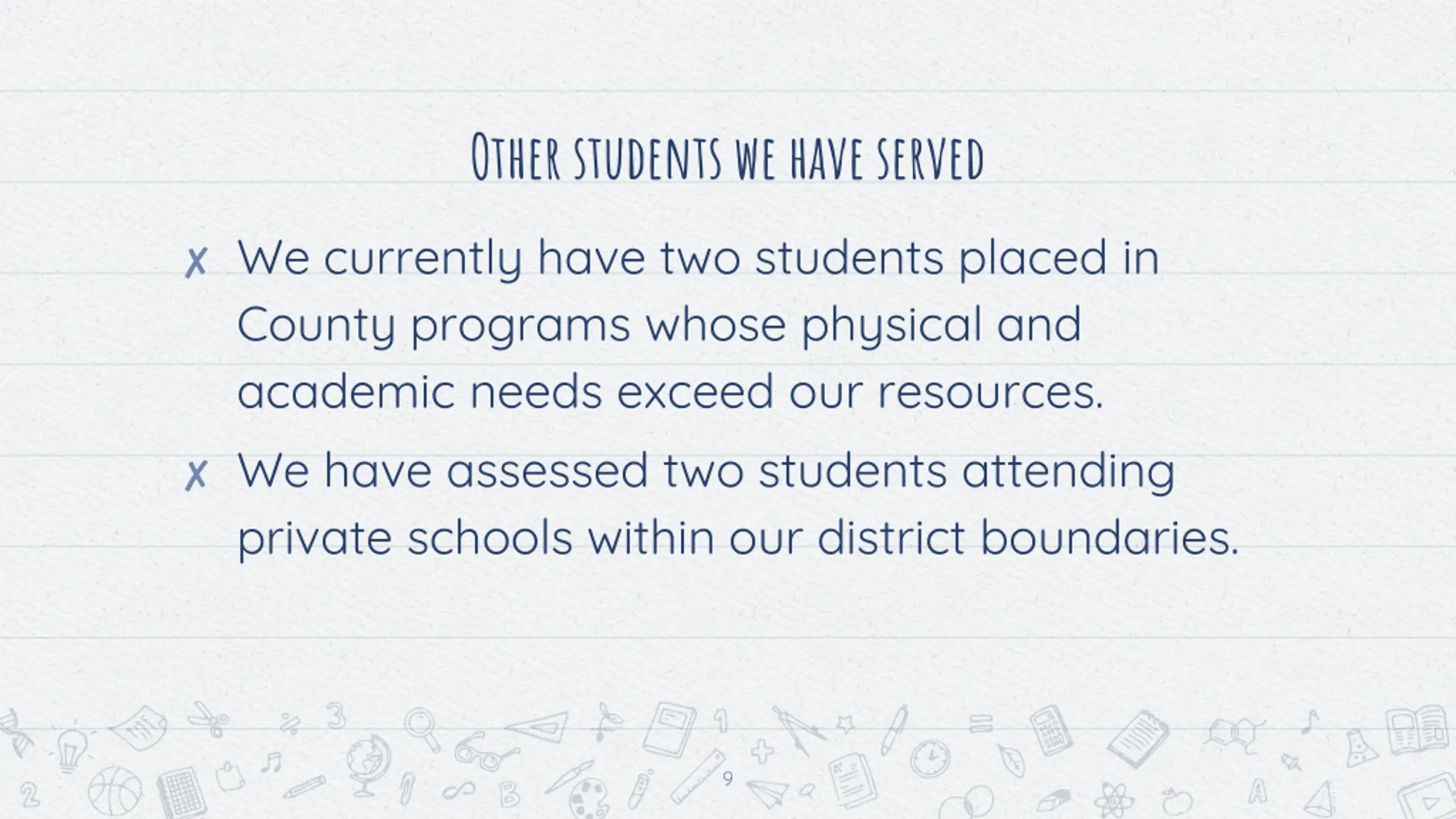 Other students we have served We currently have two students placed in County programs whose physical and academic needs exceed our resources. We have assessed two students attending private schools within our district boundaries. 9