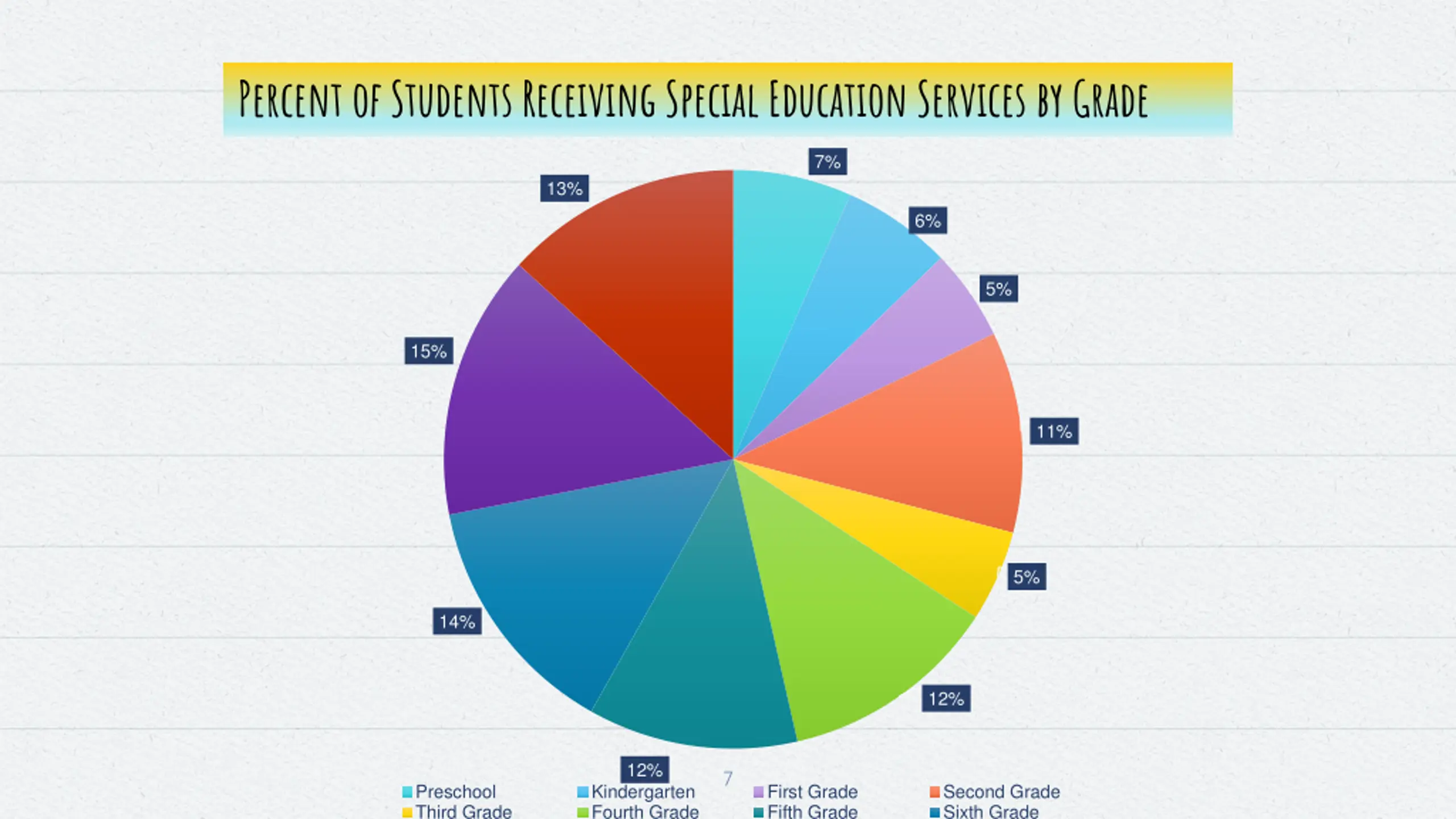 Percent of Students Receiving Special Education Services by Grade 7% 13% 6% 5% 15% 11% 5% 14% 12% 12% 7 Preschool Third Grade Kindergarten Fourth Grade First Grade Fifth Grade Second Grade Sixth Grade