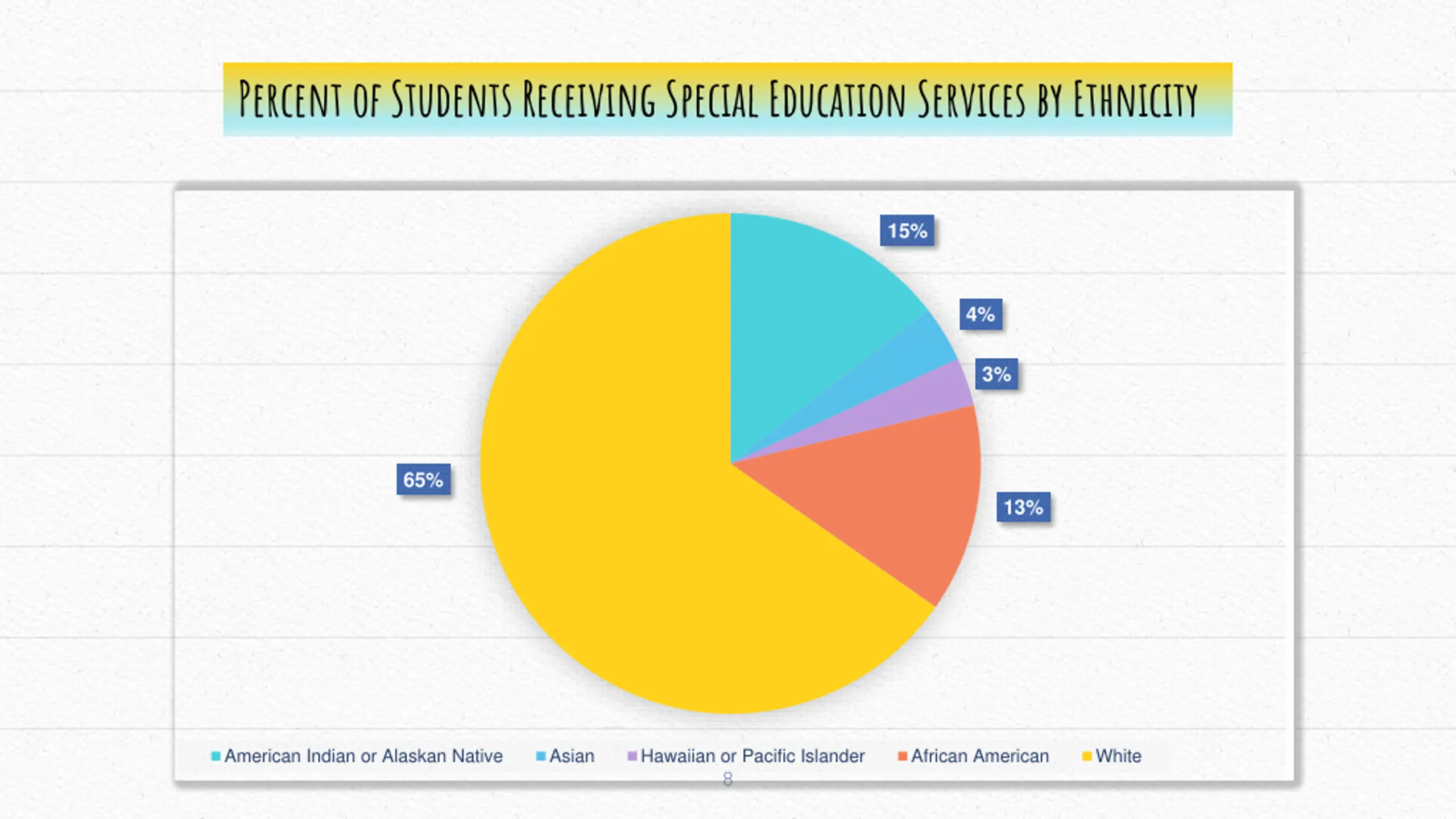 Percent of Students Receiving Special Education Services by Ethnicity 15% 4% 3% 65% 13% American Indian or Alaskan Native Asian Hawaiian or Pacific Islander African American White 8