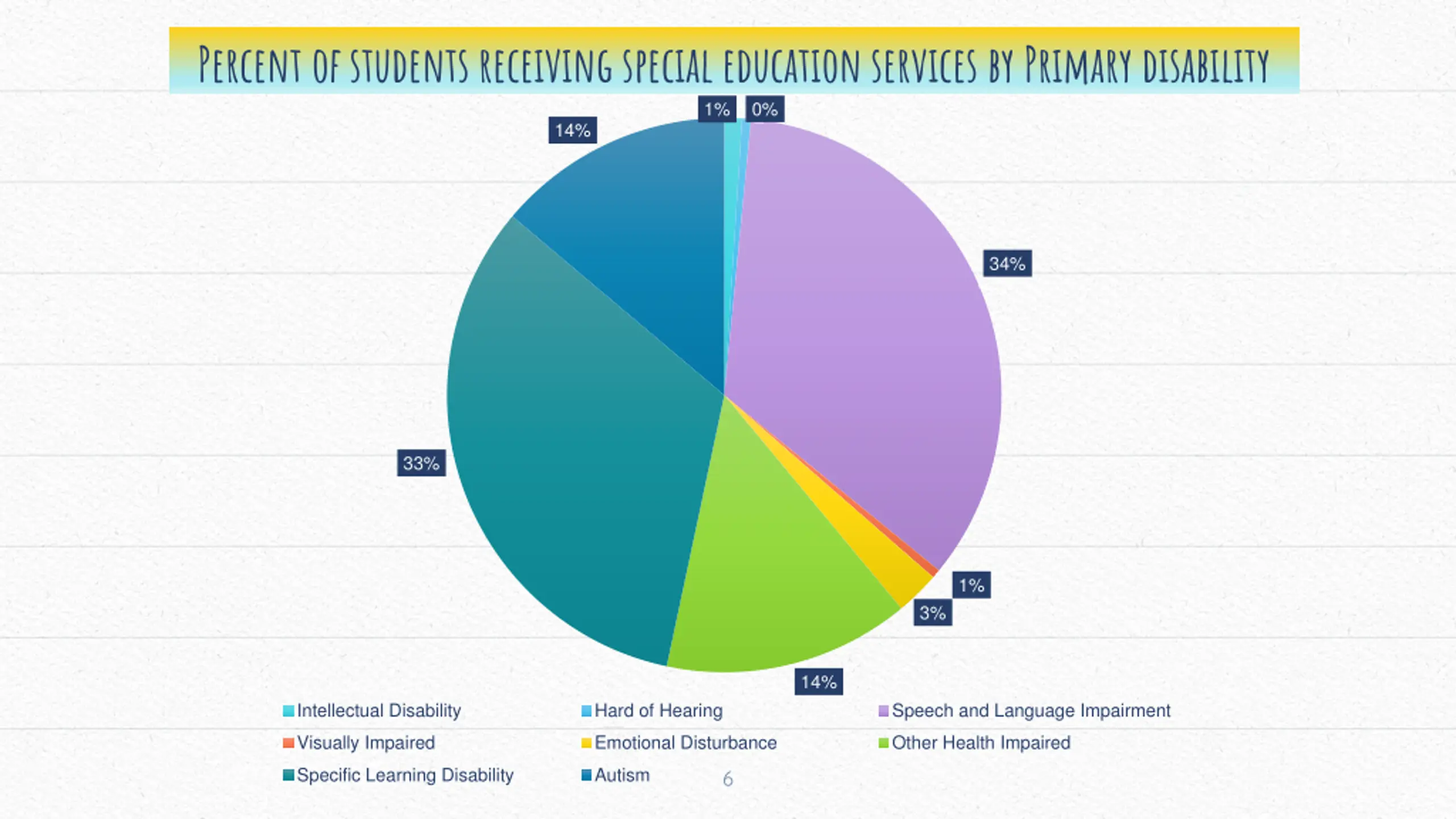 Percent of students receiving special education services by Primary disability 1% 14% 0% 34% 33% 1% 3% 14% Intellectual Disability Hard of Hearing Speech and Language Impairment Visually Impaired Emotional Disturbance Other Health Impaired Specific Learning Disability Autism 6