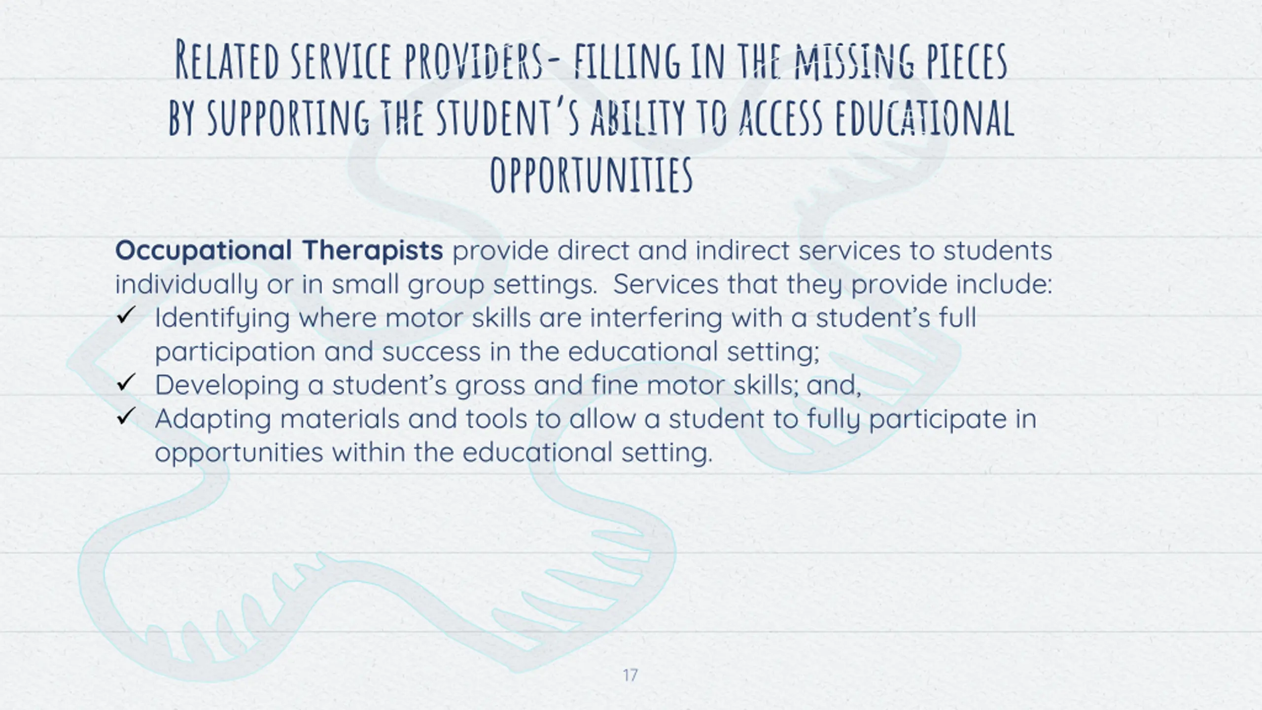 Related service providers-filling in the missing pieces by supporting the student s ability to access educational opportunities Occupational Therapists provide direct and indirect services to students individually or in small group settings. Services that they provide include: Identifying where motor skills are interfering with a student s full participation and success in the educational setting; Developing a student s gross and fine motor skills; and, Adapting materials and tools to allow a student to fully participate in opportunities within the educational setting. 17