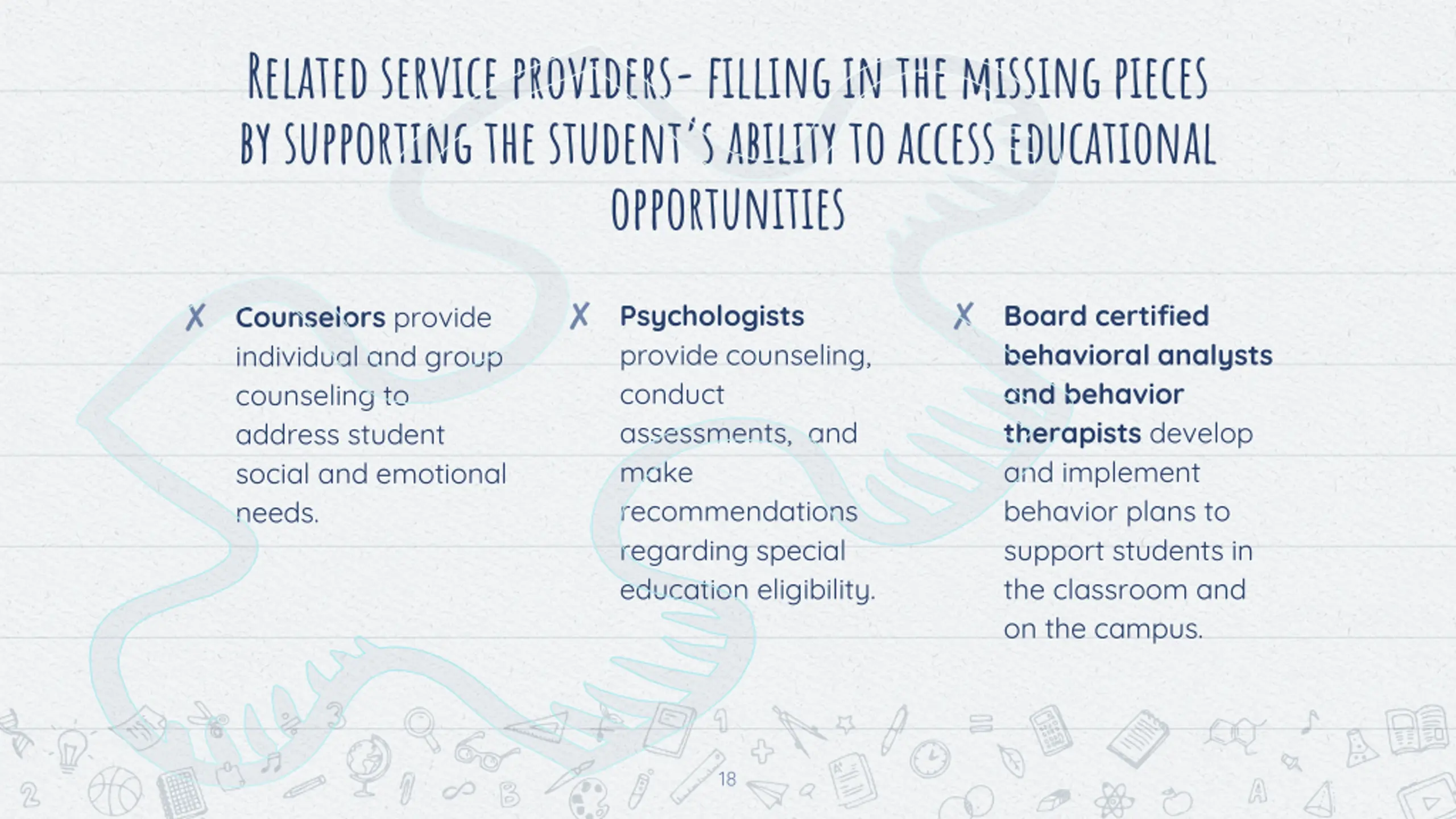 Related service providers-filling in the missing pieces by supporting the student s ability to access educational opportunities Psychologists provide counseling, conduct assessments, and make recommendations regarding special education eligibility. Board certified behavioral analysts and behavior therapists develop and implement behavior plans to support students in the classroom and on the campus. Counselors provide individual and group counseling to address student social and emotional needs. 18