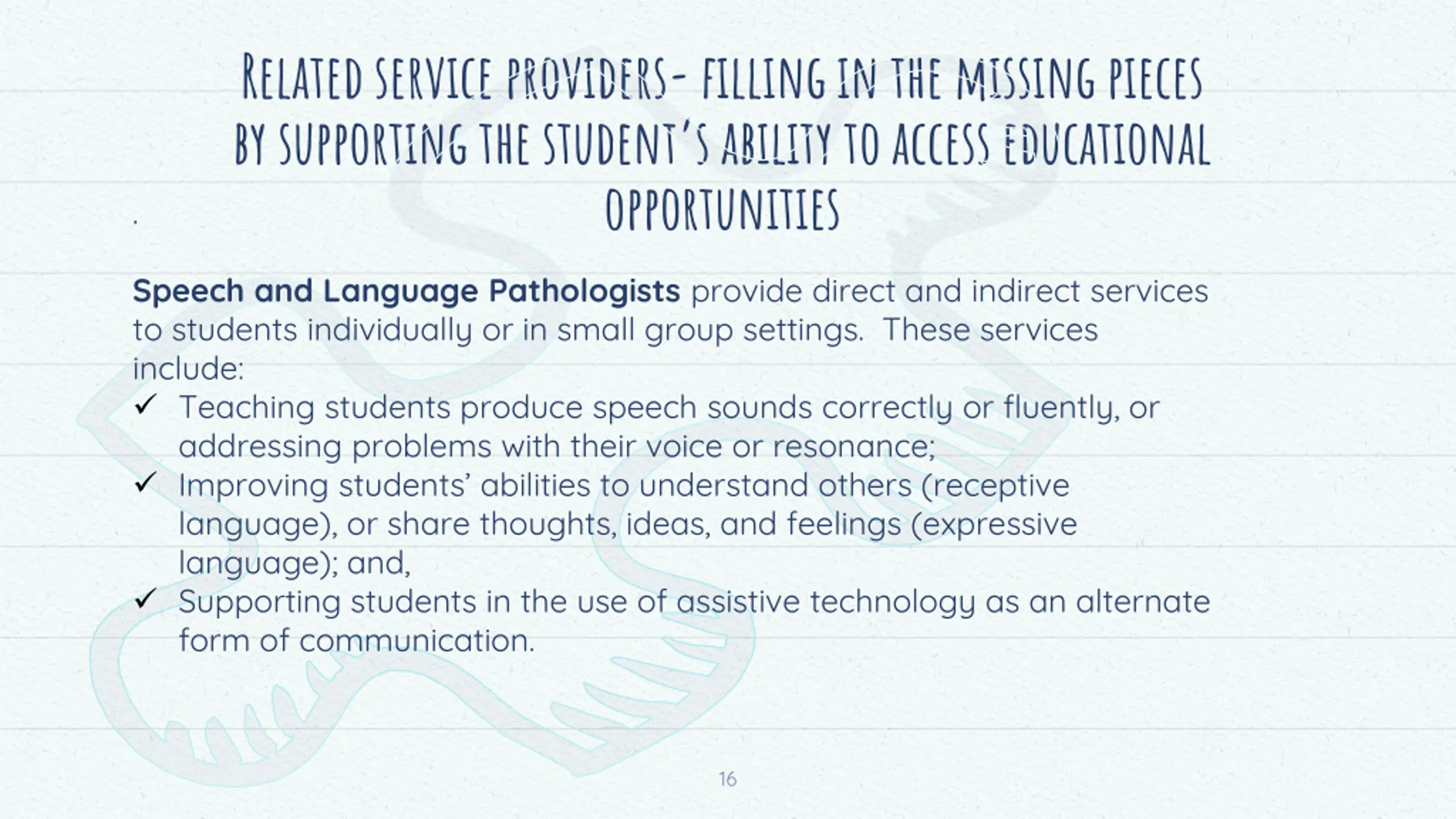 Related service providers-filling in the missing pieces by supporting the student s ability to access educational opportunities . Speech and Language Pathologists provide direct and indirect services to students individually or in small group settings. These services include: Teaching students produce speech sounds correctly or fluently, or addressing problems with their voice or resonance; Improving students abilities to understand others (receptive language), or share thoughts, ideas, and feelings (expressive language); and, Supporting students in the use of assistive technology as an alternate form of communication. 16