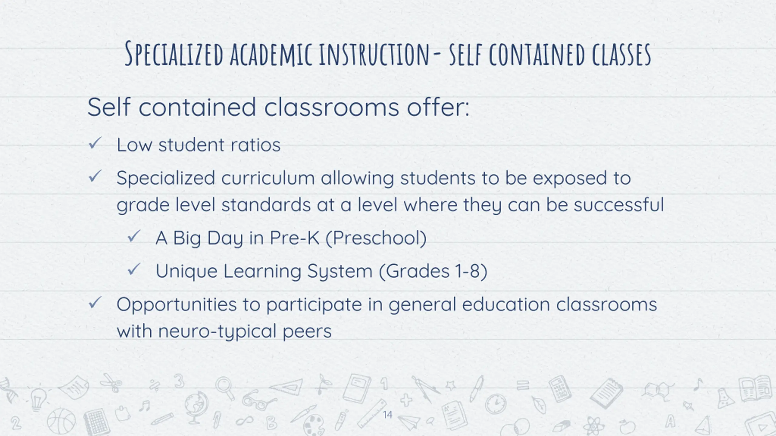 Specialized academic instruction-self contained classes Self contained classrooms offer: Low student ratios Specialized curriculum allowing students to be exposed to grade level standards at a level where they can be successful A Big Day in Pre-K (Preschool) Unique Learning System (Grades 1-8) Opportunities to participate in general education classrooms with neuro-typical peers 14