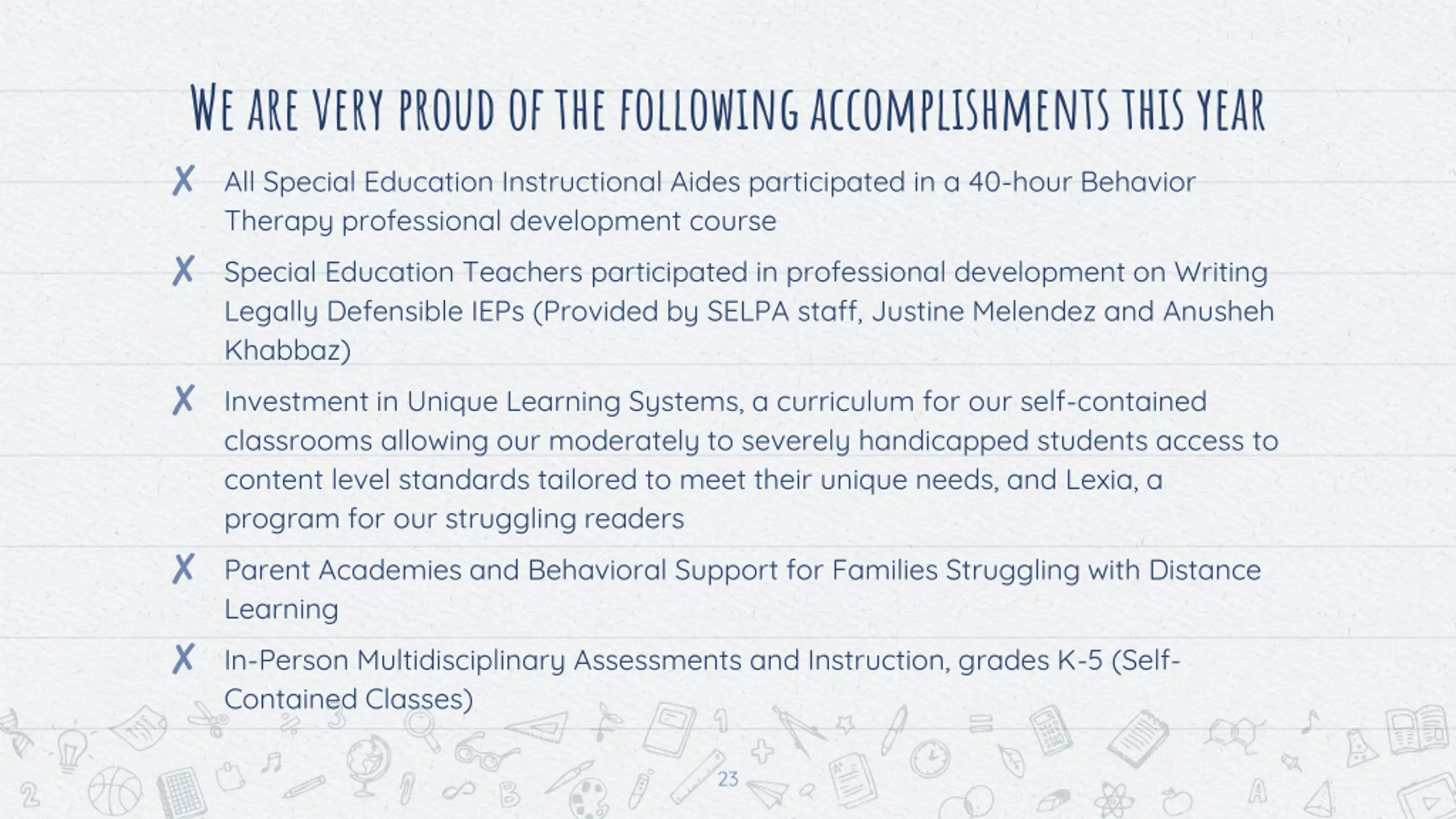We are very proud of the following accomplishments this year All Special Education Instructional Aides participated in a 40-hour Behavior Therapy professional development course Special Education Teachers participated in professional development on Writing Legally Defensible IEPs (Provided by SELPA staff, Justine Melendez and Anusheh Khabbaz) Investment in Unique Learning Systems, a curriculum for our self-contained classrooms allowing our moderately to severely handicapped students access to content level standards tailored to meet their unique needs, and Lexia, a program for our struggling readers Parent Academies and Behavioral Support for Families Struggling with Distance Learning In-Person Multidisciplinary Assessments and Instruction, grades K-5 (Self- Contained Classes) 23