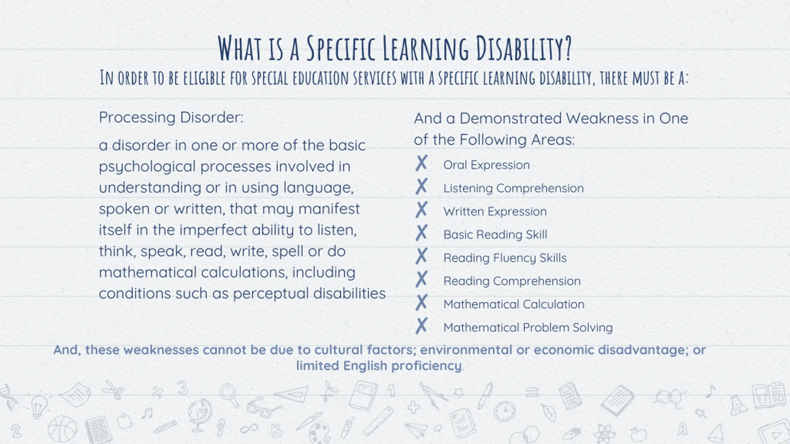 What is a Specific Learning Disability? In order to be eligible for special education services with a specific learning disability, there must be a: Processing Disorder: And a Demonstrated Weakness in One of the Following Areas: Oral Expression Listening Comprehension Written Expression Basic Reading Skill Reading Fluency Skills Reading Comprehension Mathematical Calculation Mathematical Problem Solving a disorder in one or more of the basic psychological processes involved in understanding or in using language, spoken or written, that may manifest itself in the imperfect ability to listen, think, speak, read, write, spell or do mathematical calculations, including conditions such as perceptual disabilities And, these weaknesses cannot be due to cultural factors; environmental or economic disadvantage; or limited English proficiency.