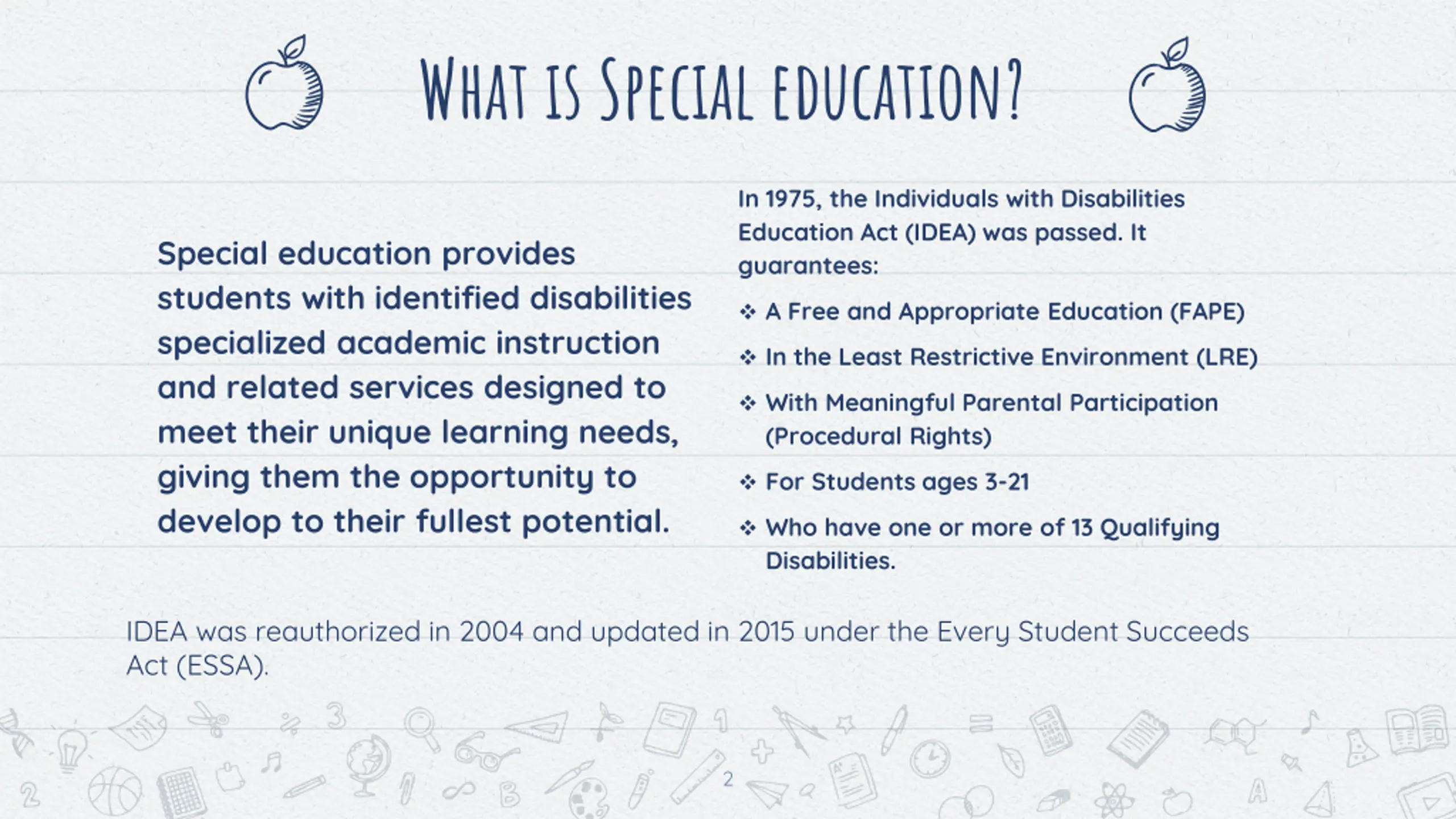 What is Special education? In 1975, the Individuals with Disabilities Education Act (IDEA) was passed. It guarantees: Special education provides students with identified disabilities specialized academic instruction and related services designed to meet their unique learning needs, giving them the opportunity to develop to their fullest potential. A Free and Appropriate Education (FAPE) In the Least Restrictive Environment (LRE) With Meaningful Parental Participation (Procedural Rights) For Students ages 3-21 Who have one or more of 13 Qualifying Disabilities. IDEA was reauthorized in 2004 and updated in 2015 under the Every Student Succeeds Act (ESSA). 2