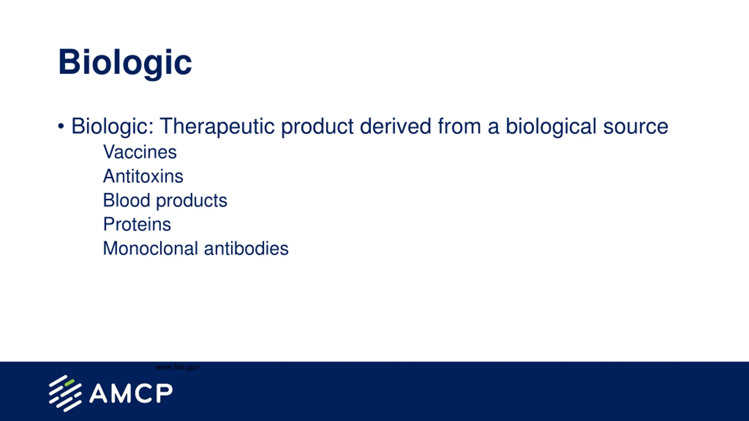 Biologic Biologic: Therapeutic product derived from a biological source Vaccines Antitoxins Blood products Proteins Monoclonal antibodies www.fda.gov