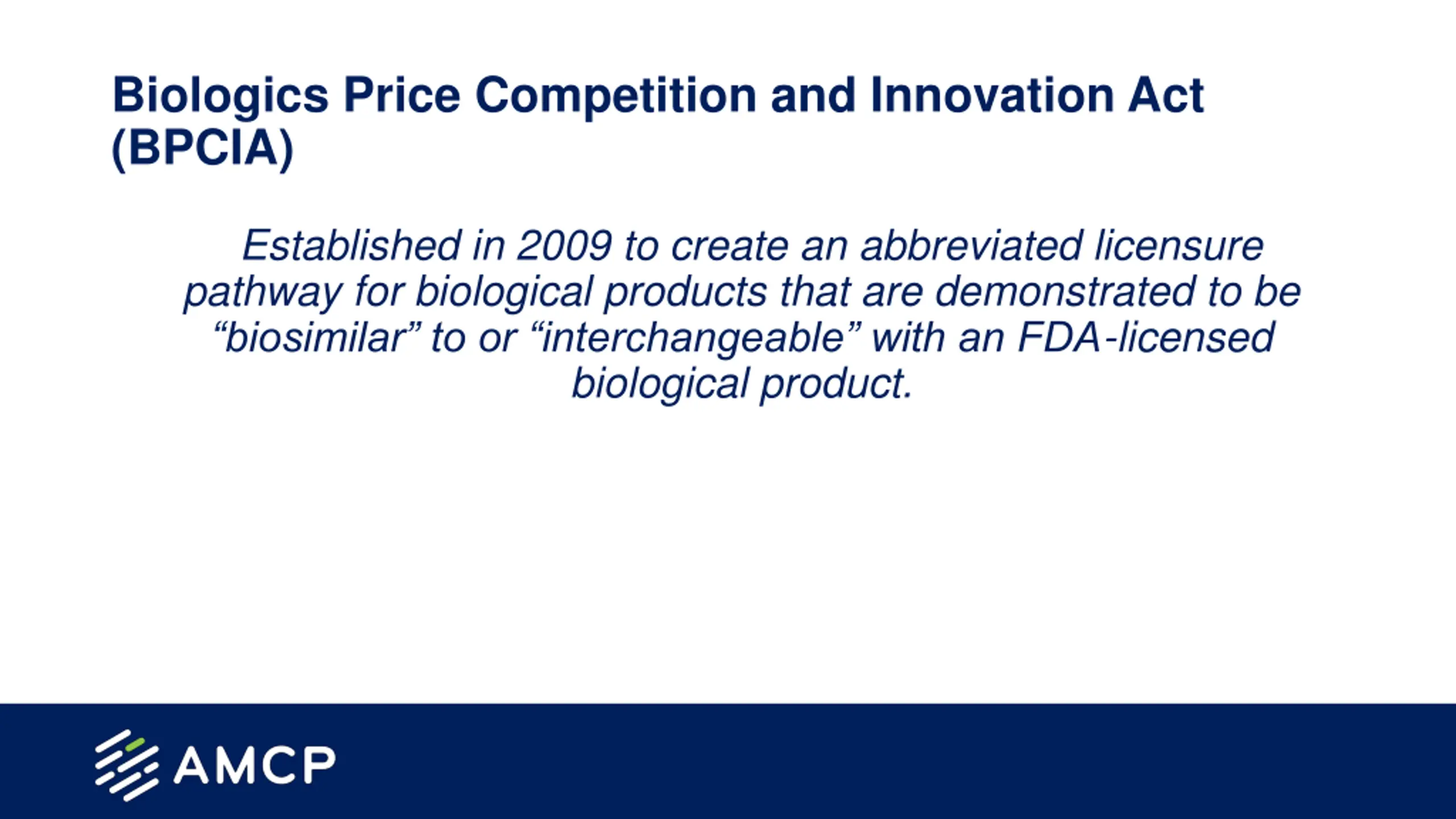 Biologics Price Competition and Innovation Act (BPCIA) Established in 2009 to create an abbreviated licensure pathway for biological products that are demonstrated to be biosimilar to or interchangeable with an FDA-licensed biological product.