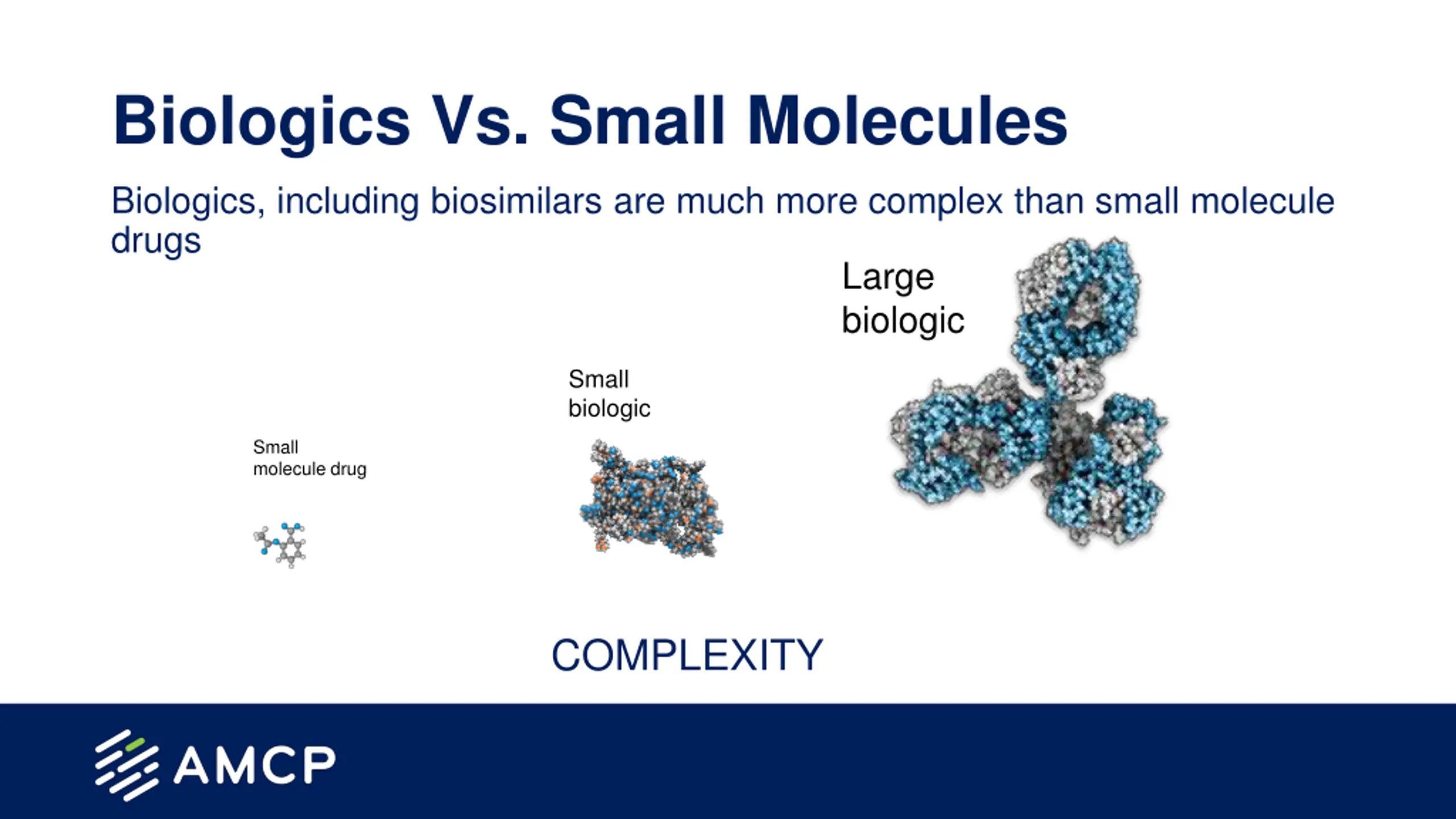 Biologics Vs. Small Molecules Biologics, including biosimilars are much more complex than small molecule drugs Large biologic Small biologic Small molecule drug COMPLEXITY