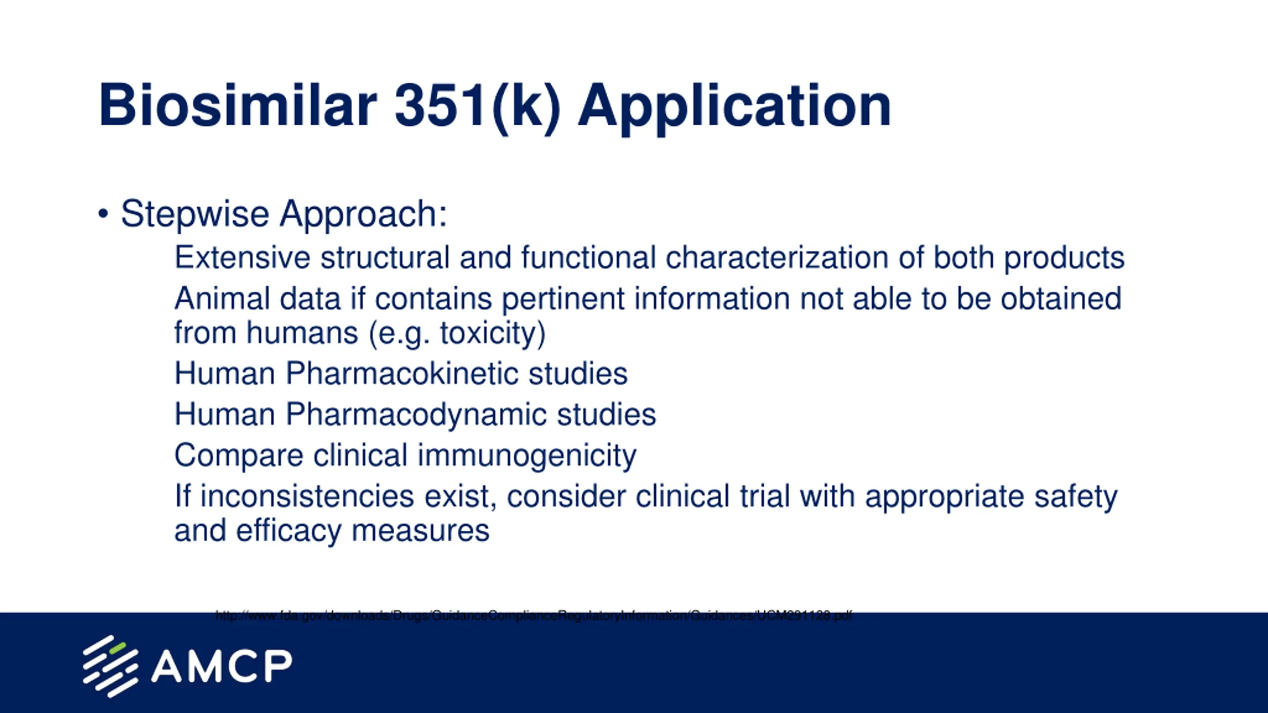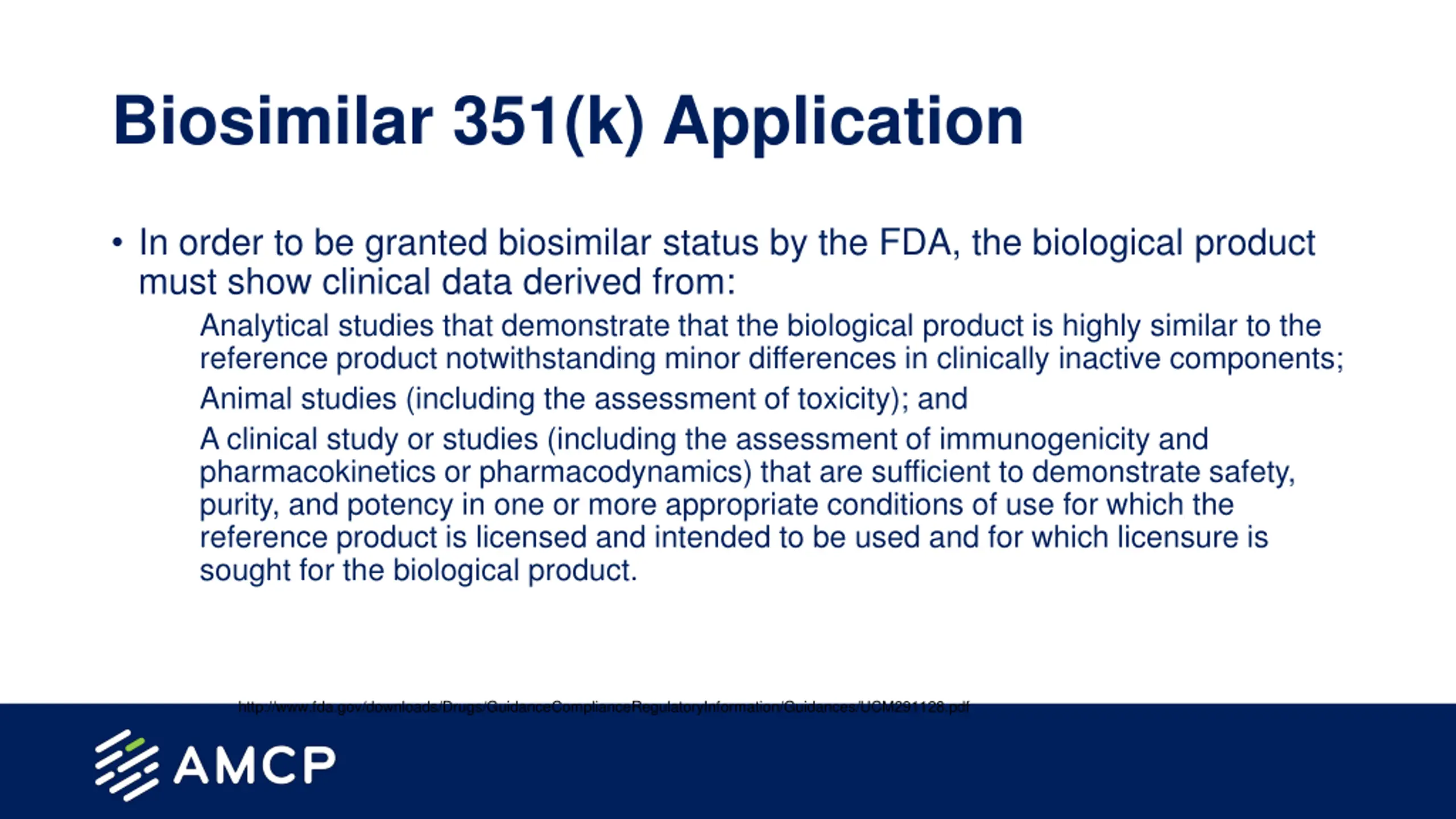 Biosimilar 351(k) Application In order to be granted biosimilar status by the FDA, the biological product must show clinical data derived from: Analytical studies that demonstrate that the biological product is highly similar to the reference product notwithstanding minor differences in clinically inactive components; Animal studies (including the assessment of toxicity); and A clinical study or studies (including the assessment of immunogenicity and pharmacokinetics or pharmacodynamics) that are sufficient to demonstrate safety, purity, and potency in one or more appropriate conditions of use for which the reference product is licensed and intended to be used and for which licensure is sought for the biological product. http://www.fda.gov/downloads/Drugs/GuidanceComplianceRegulatoryInformation/Guidances/UCM291128.pdf