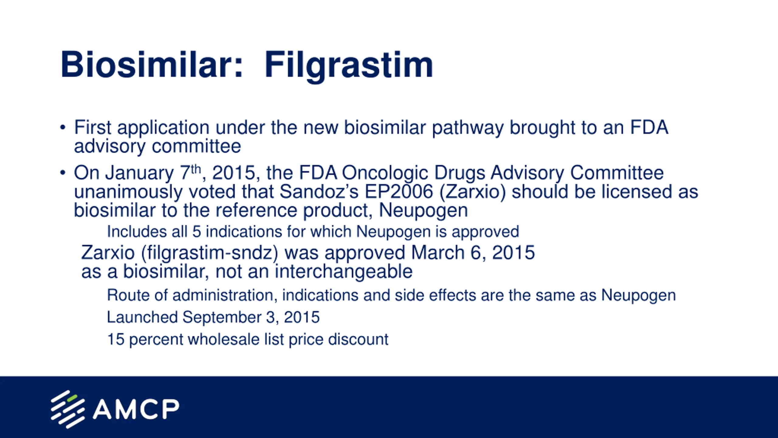 Biosimilar: Filgrastim First application under the new biosimilar pathway brought to an FDA advisory committee On January 7th, 2015, the FDA Oncologic Drugs Advisory Committee unanimously voted that Sandoz s EP2006 (Zarxio) should be licensed as biosimilar to the reference product, Neupogen Includes all 5 indications for which Neupogen is approved Zarxio (filgrastim-sndz) was approved March 6, 2015 as a biosimilar, not an interchangeable Route of administration, indications and side effects are the same as Neupogen Launched September 3, 2015 15 percent wholesale list price discount