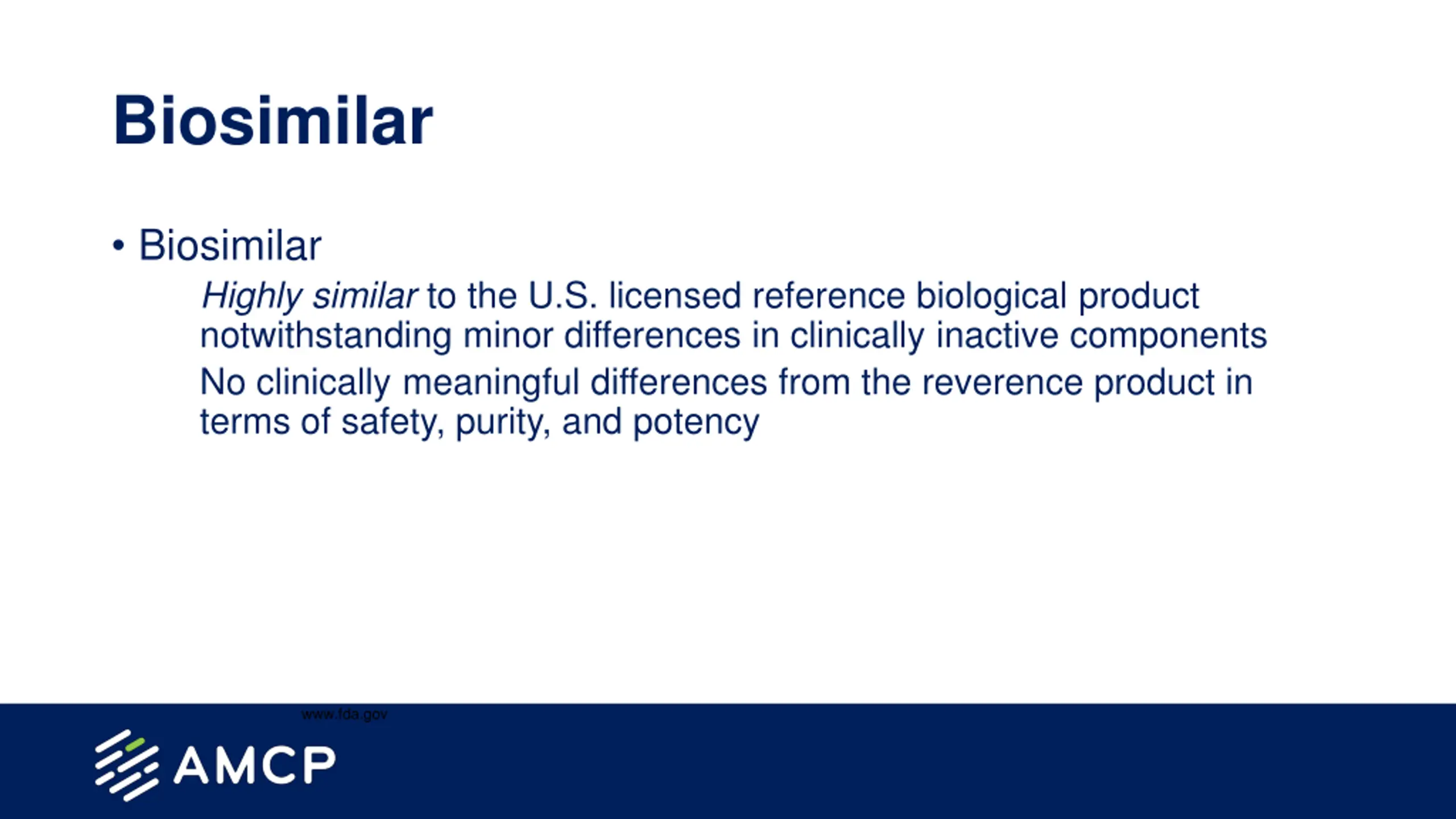 Biosimilar Biosimilar Highly similar to the U.S. licensed reference biological product notwithstanding minor differences in clinically inactive components No clinically meaningful differences from the reverence product in terms of safety, purity, and potency www.fda.gov