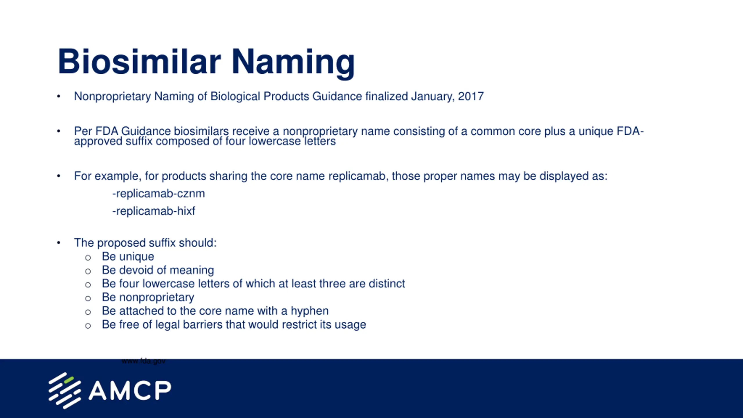 Biosimilar Naming Nonproprietary Naming of Biological Products Guidance finalized January, 2017 Per FDA Guidance biosimilars receive a nonproprietary name consisting of a common core plus a unique FDA- approved suffix composed of four lowercase letters For example, for products sharing the core name replicamab, those proper names may be displayed as: -replicamab-cznm -replicamab-hixf The proposed suffix should: o Be unique o Be devoid of meaning o Be four lowercase letters of which at least three are distinct o Be nonproprietary o Be attached to the core name with a hyphen o Be free of legal barriers that would restrict its usage www.fda.gov