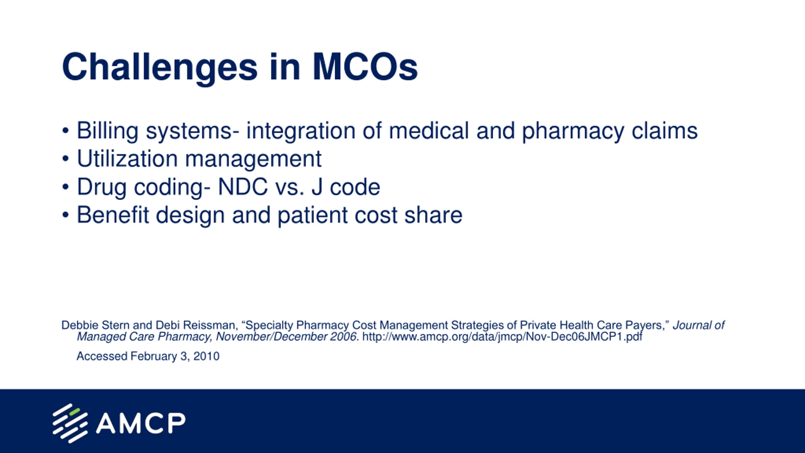 Challenges in MCOs Billing systems- integration of medical and pharmacy claims Utilization management Drug coding- NDC vs. J code Benefit design and patient cost share Debbie Stern and Debi Reissman, Specialty Pharmacy Cost Management Strategies of Private Health Care Payers, Journal of Managed Care Pharmacy, November/December 2006. http://www.amcp.org/data/jmcp/Nov-Dec06JMCP1.pdf Accessed February 3, 2010