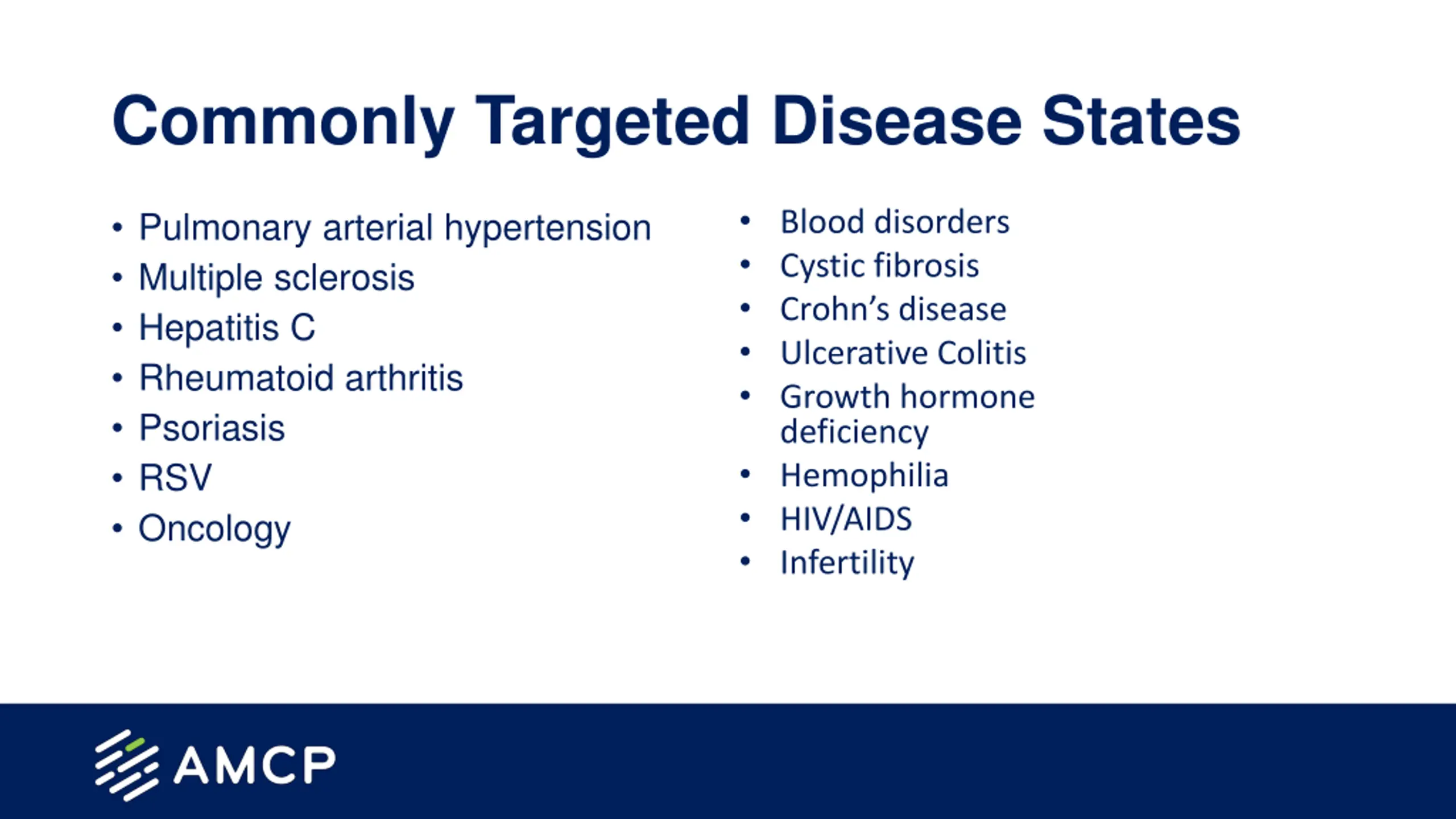 Commonly Targeted Disease States Blood disorders Cystic fibrosis Crohn s disease Ulcerative Colitis Growth hormone deficiency Hemophilia HIV/AIDS Infertility Pulmonary arterial hypertension Multiple sclerosis Hepatitis C Rheumatoid arthritis Psoriasis RSV Oncology