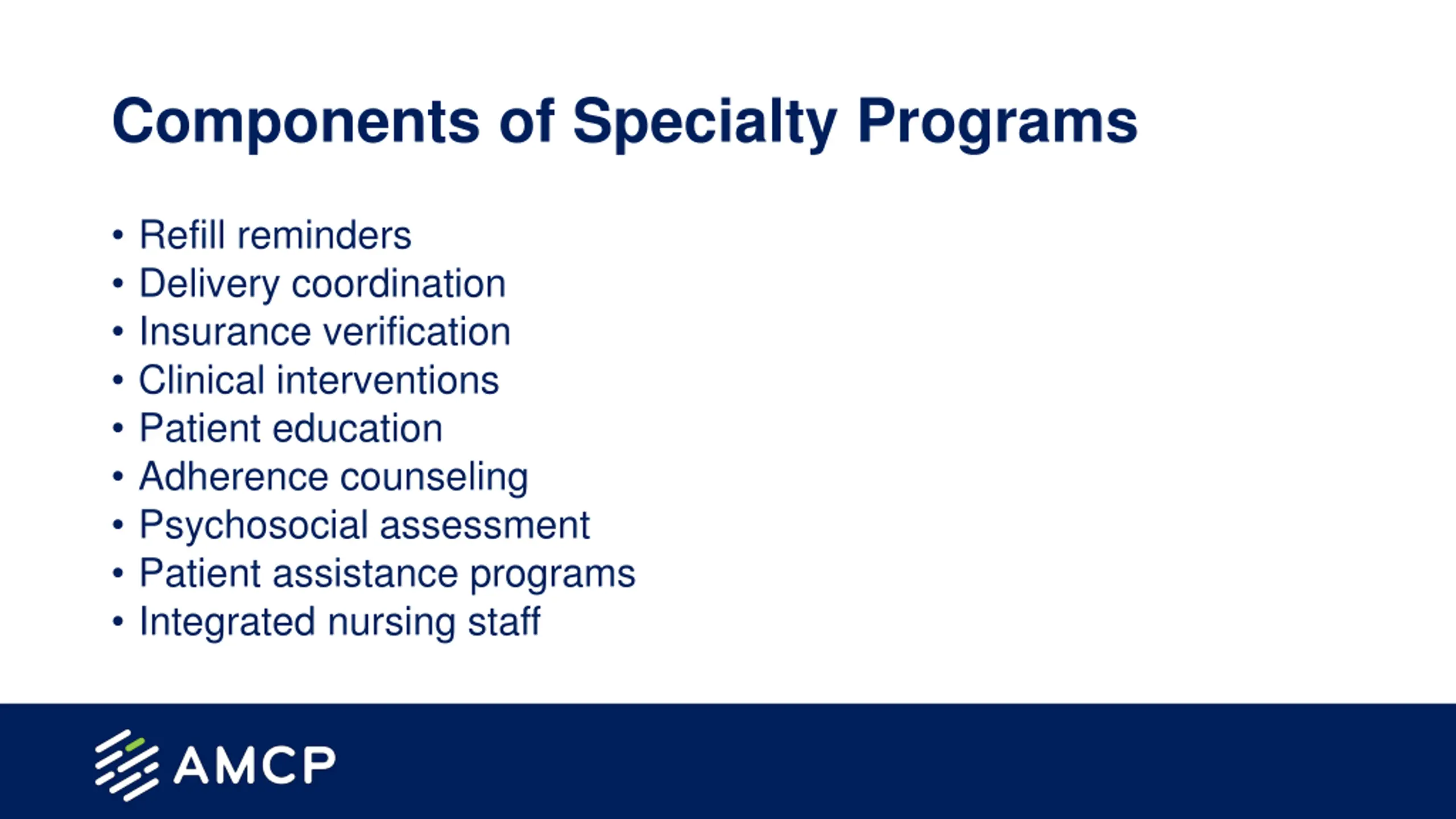 Components of Specialty Programs Refill reminders Delivery coordination Insurance verification Clinical interventions Patient education Adherence counseling Psychosocial assessment Patient assistance programs Integrated nursing staff