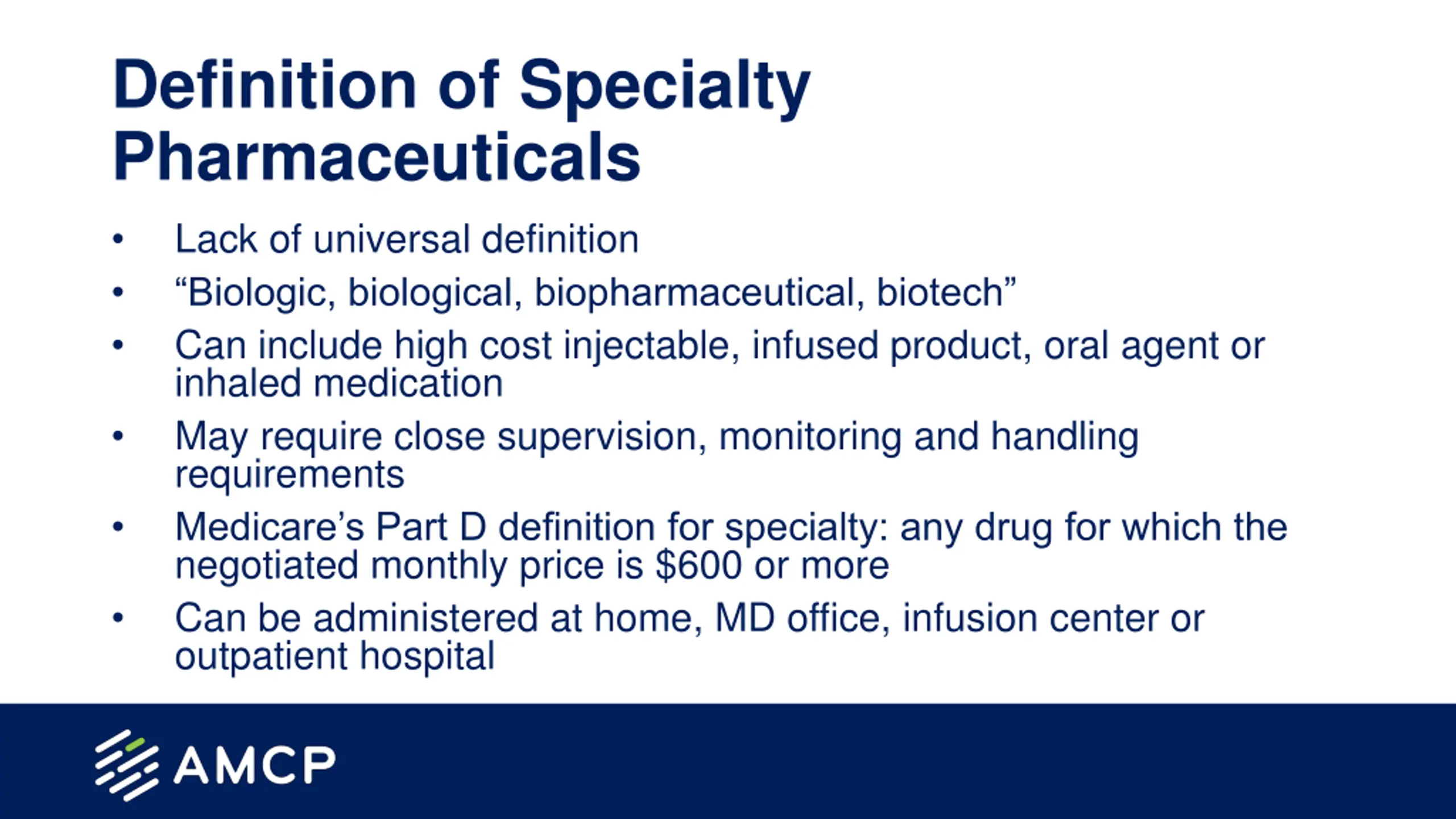Definition of Specialty Pharmaceuticals Lack of universal definition Biologic, biological, biopharmaceutical, biotech Can include high cost injectable, infused product, oral agent or inhaled medication May require close supervision, monitoring and handling requirements Medicare s Part D definition for specialty: any drug for which the negotiated monthly price is $600 or more Can be administered at home, MD office, infusion center or outpatient hospital