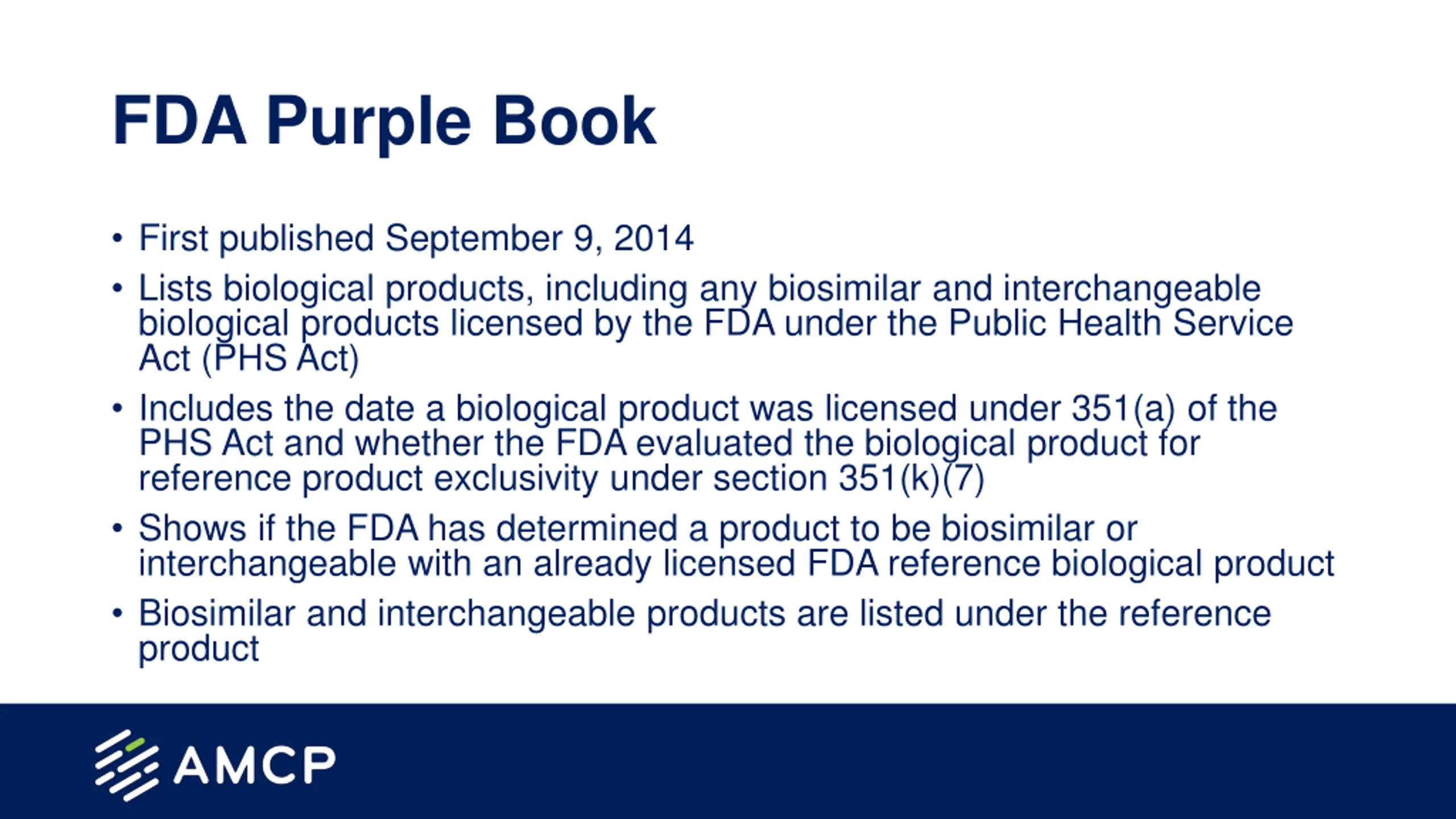 FDA Purple Book First published September 9, 2014 Lists biological products, including any biosimilar and interchangeable biological products licensed by the FDA under the Public Health Service Act (PHS Act) Includes the date a biological product was licensed under 351(a) of the PHS Act and whether the FDA evaluated the biological product for reference product exclusivity under section 351(k)(7) Shows if the FDA has determined a product to be biosimilar or interchangeable with an already licensed FDA reference biological product Biosimilar and interchangeable products are listed under the reference product