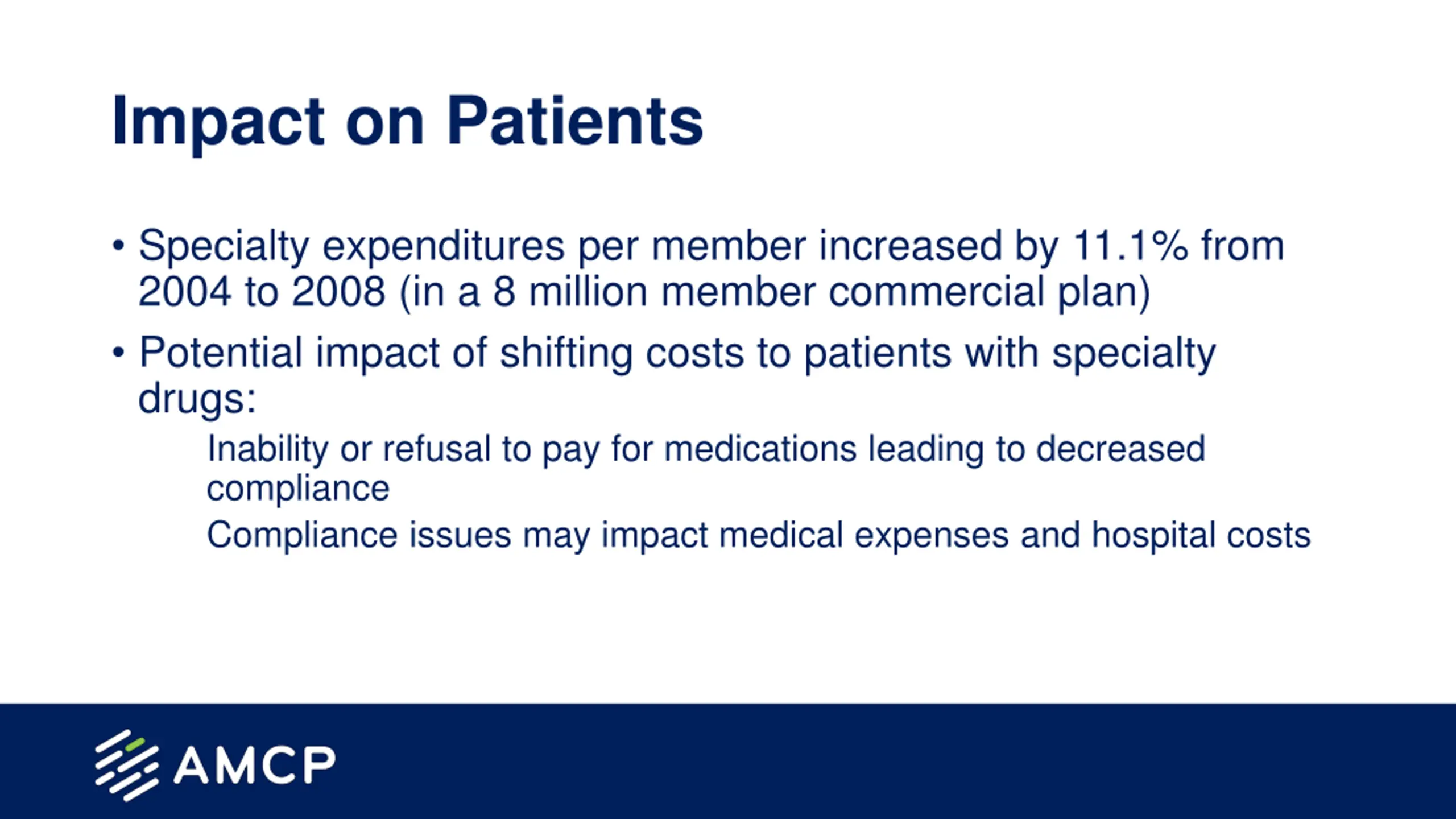 Impact on Patients Specialty expenditures per member increased by 11.1% from 2004 to 2008 (in a 8 million member commercial plan) Potential impact of shifting costs to patients with specialty drugs: Inability or refusal to pay for medications leading to decreased compliance Compliance issues may impact medical expenses and hospital costs