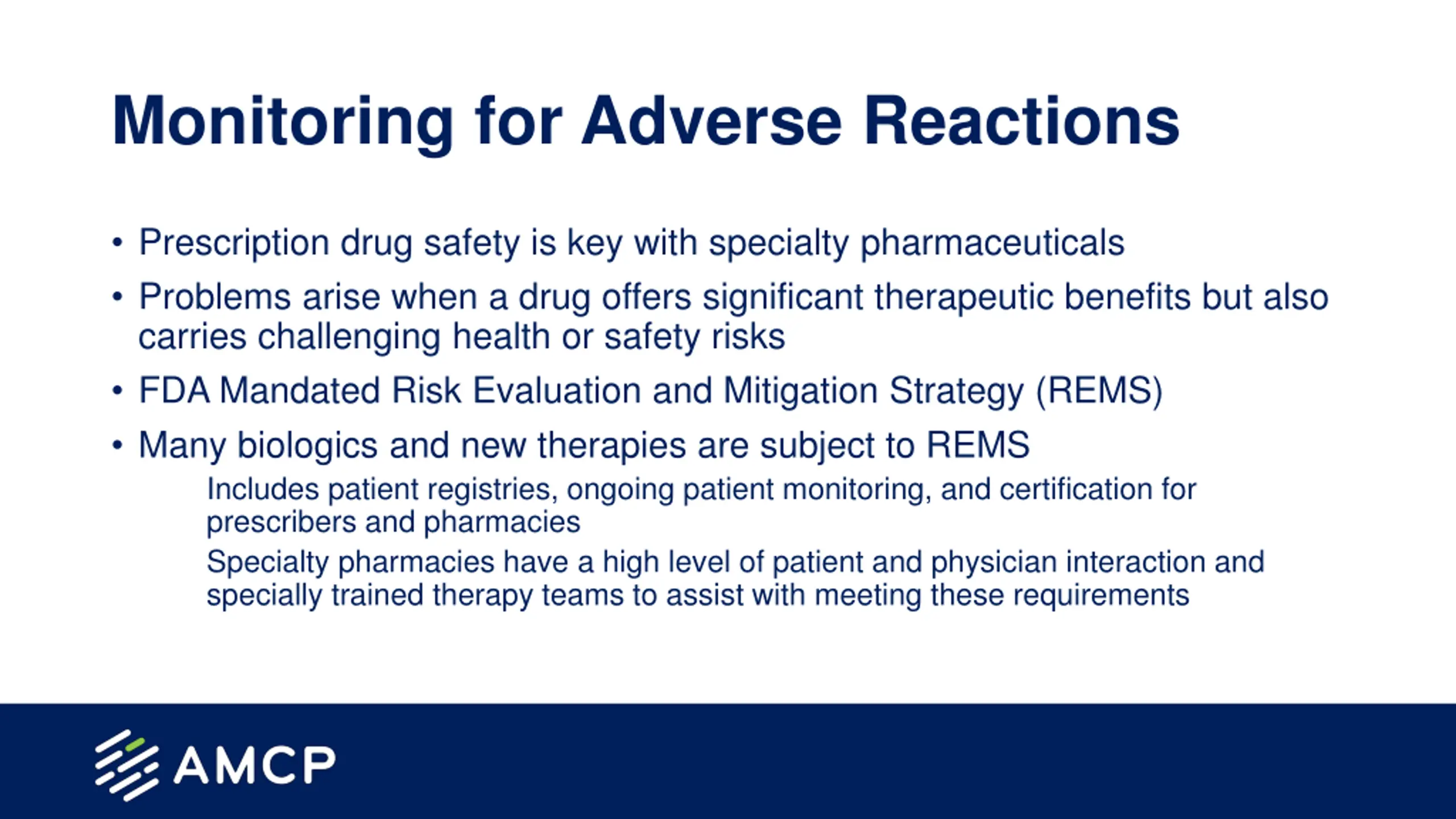 Monitoring for Adverse Reactions Prescription drug safety is key with specialty pharmaceuticals Problems arise when a drug offers significant therapeutic benefits but also carries challenging health or safety risks FDA Mandated Risk Evaluation and Mitigation Strategy (REMS) Many biologics and new therapies are subject to REMS Includes patient registries, ongoing patient monitoring, and certification for prescribers and pharmacies Specialty pharmacies have a high level of patient and physician interaction and specially trained therapy teams to assist with meeting these requirements