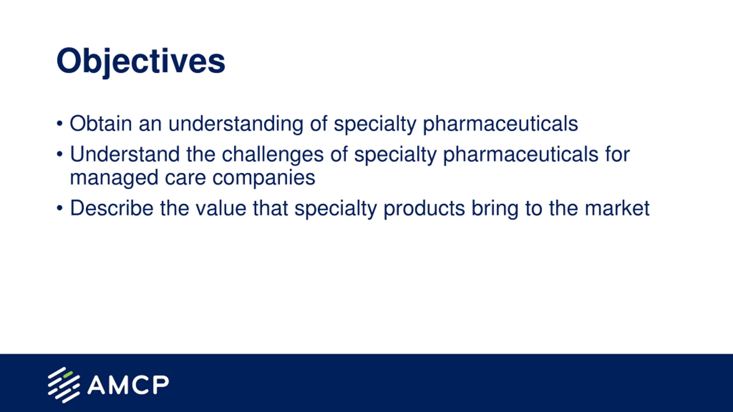 Objectives Obtain an understanding of specialty pharmaceuticals Understand the challenges of specialty pharmaceuticals for managed care companies Describe the value that specialty products bring to the market